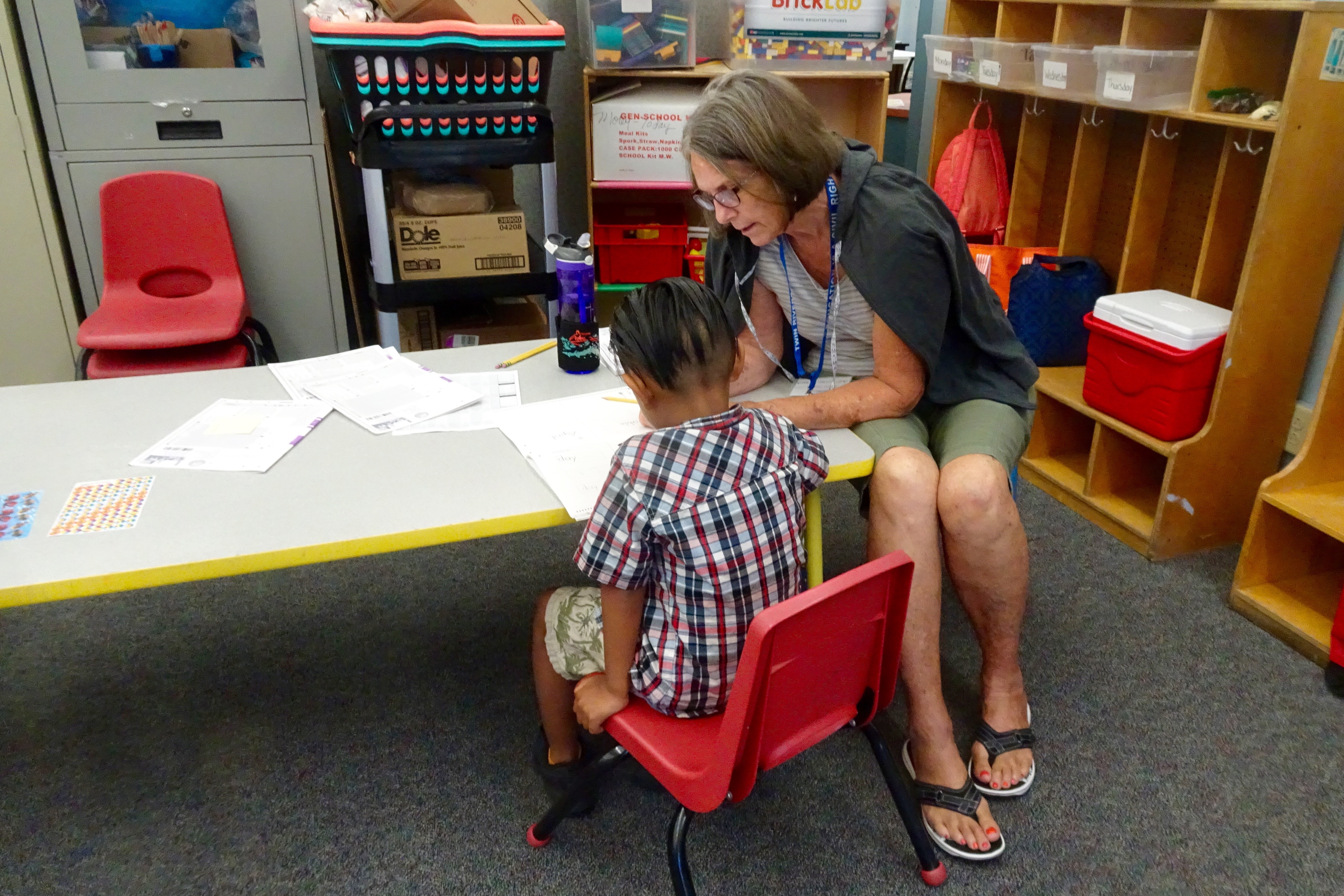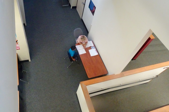 This is probably the worst testing area we’ve ever had to deal with (and totally out of compliance with the rules for proper testing area) – Jeannie was in a main hallway where classes went in and out to recess and kids left class to go to the bathroom; plus the busy noisy library was about 15 feet away. Jeannie persevered.