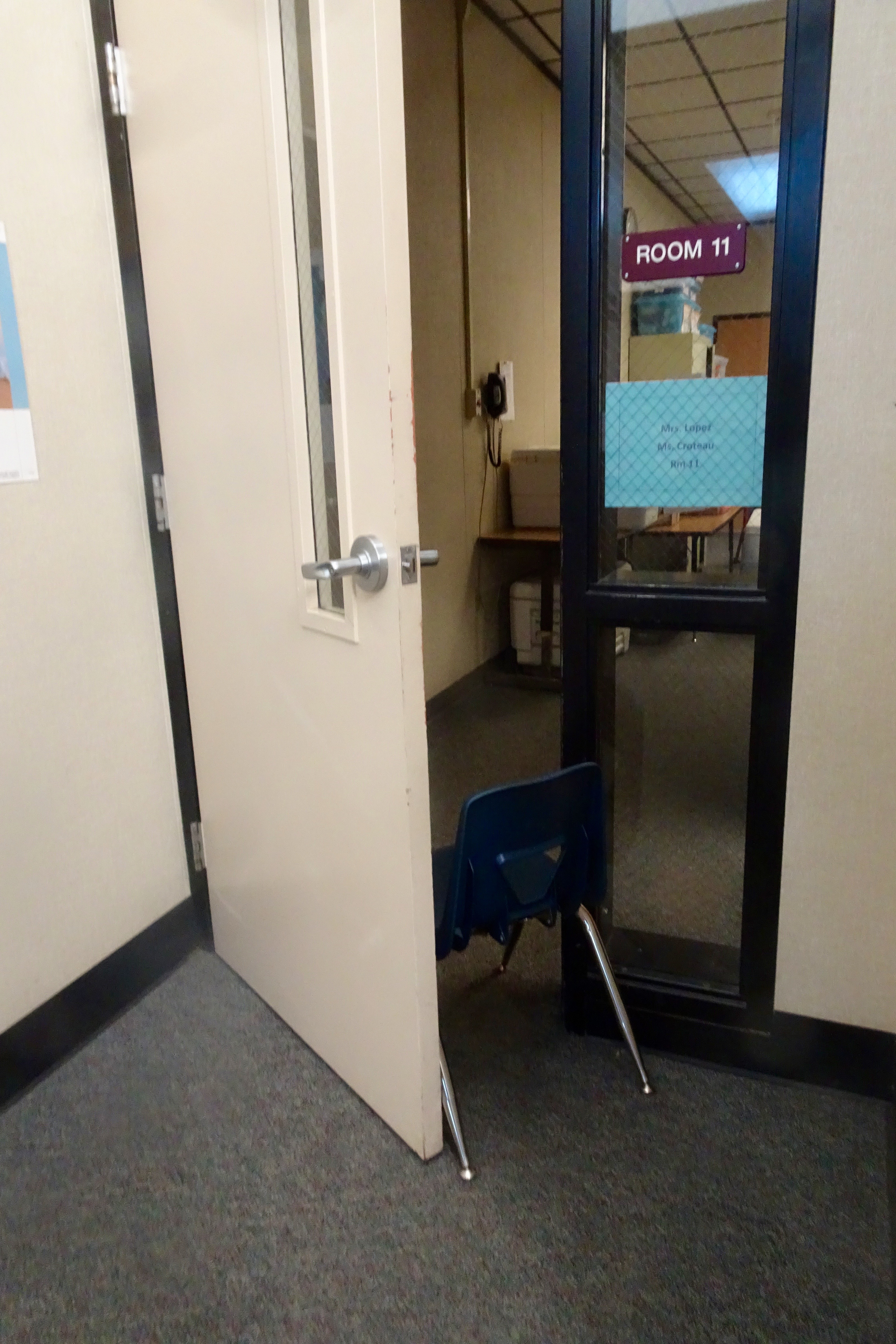 Some interior doors (like the one into our workspace) had to stay locked until 20 minutes after the start of school when students were in the building. Being a teacher trying to organize our test areas and materials didn’t qualify … a chair was our solution.
