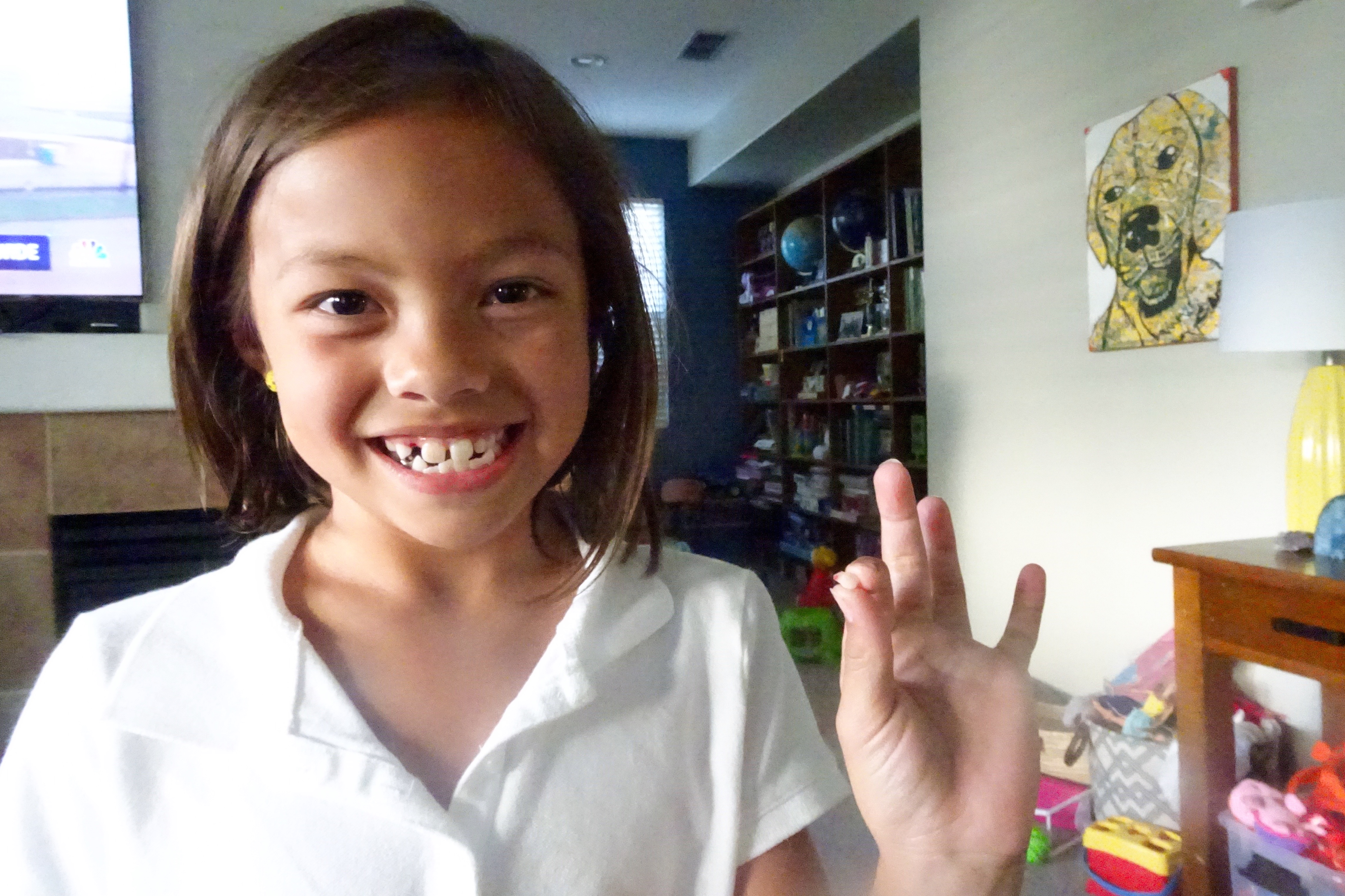 Shortly after getting home, Sophia told me she had a tooth that was barely loose. Then she went to work on it. About an hour later, ta-da!