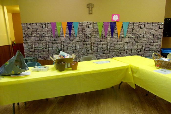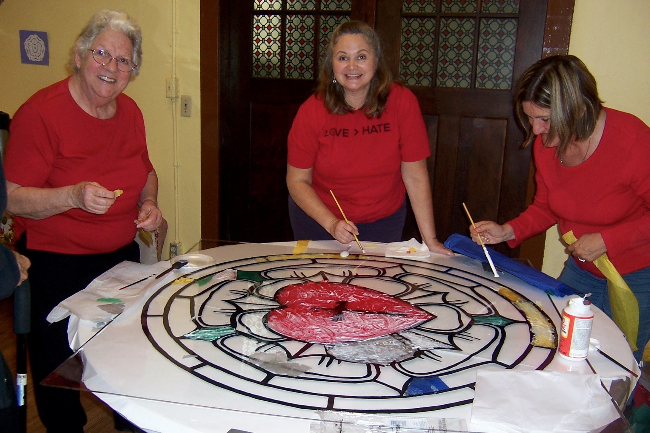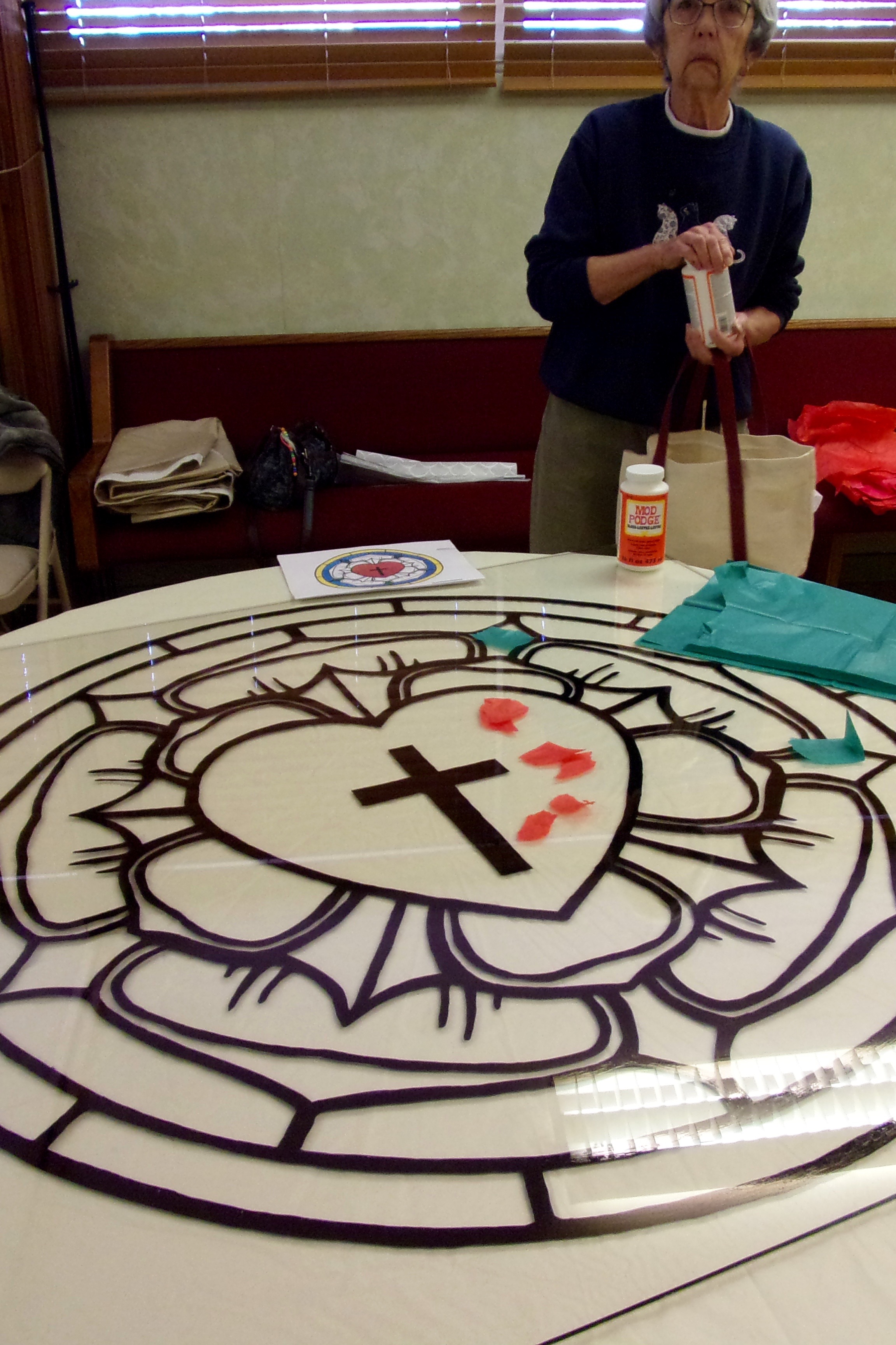 Finally we practiced how to mod-podge pieces of tissue paper onto this 48″ square piece of plexiglass of a Luther’s Rose.