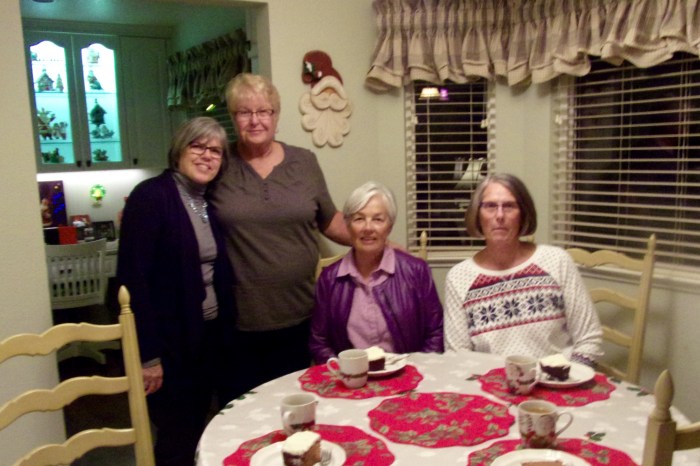 December 14, 2017 by arletelouise Progressive dinner Marna, Sandy, and I met at Adrienne’s for soup and bread.Then we drove to Sandy’s for dessert.Marna, Sandy, me, Adrienne Share this: Click to share on X (Opens in new window) X Click to share on Facebook (Opens in new window) Facebook Like Loading... Related