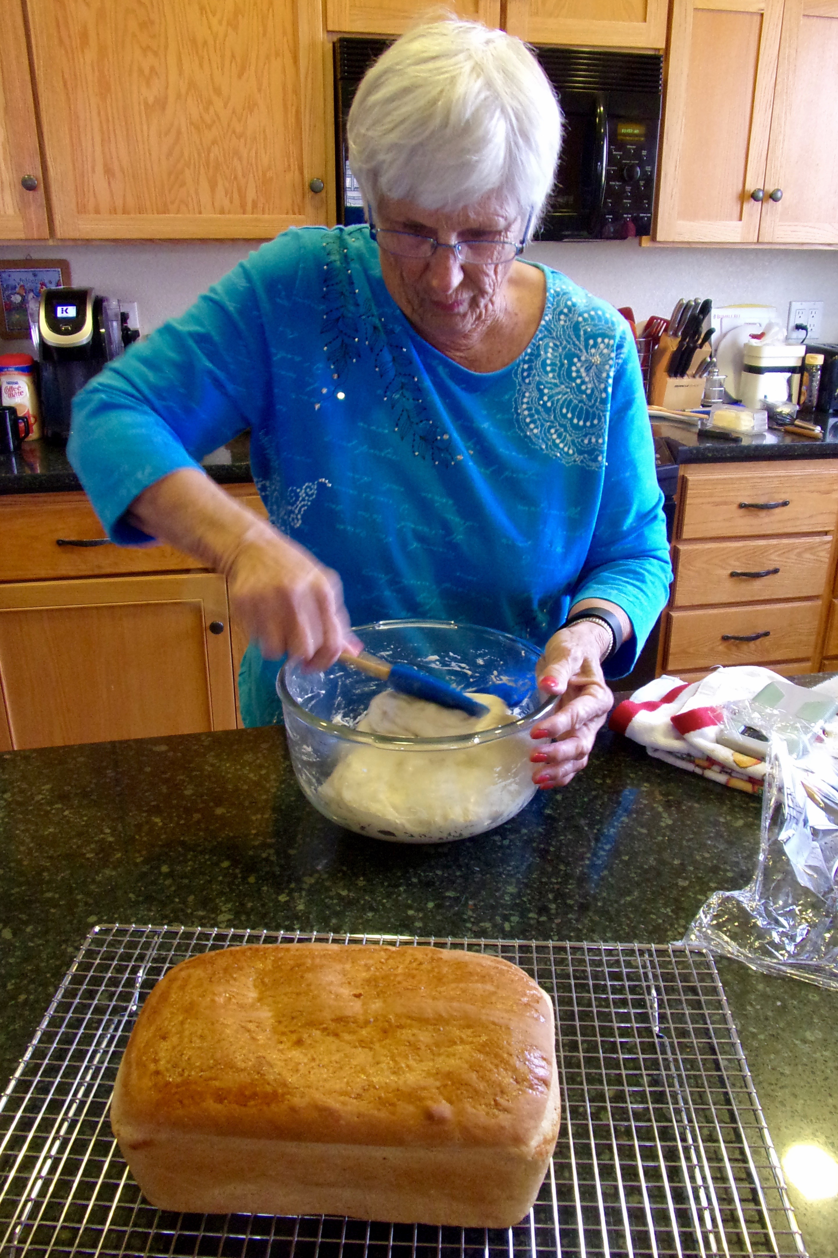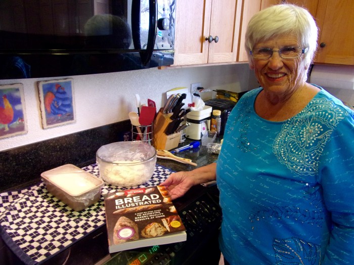 The second was Foccacia. Phyl made the biga yesterday. Here she is doing fold-and-turn-eight-times which is done every 30 minutes 3 times.