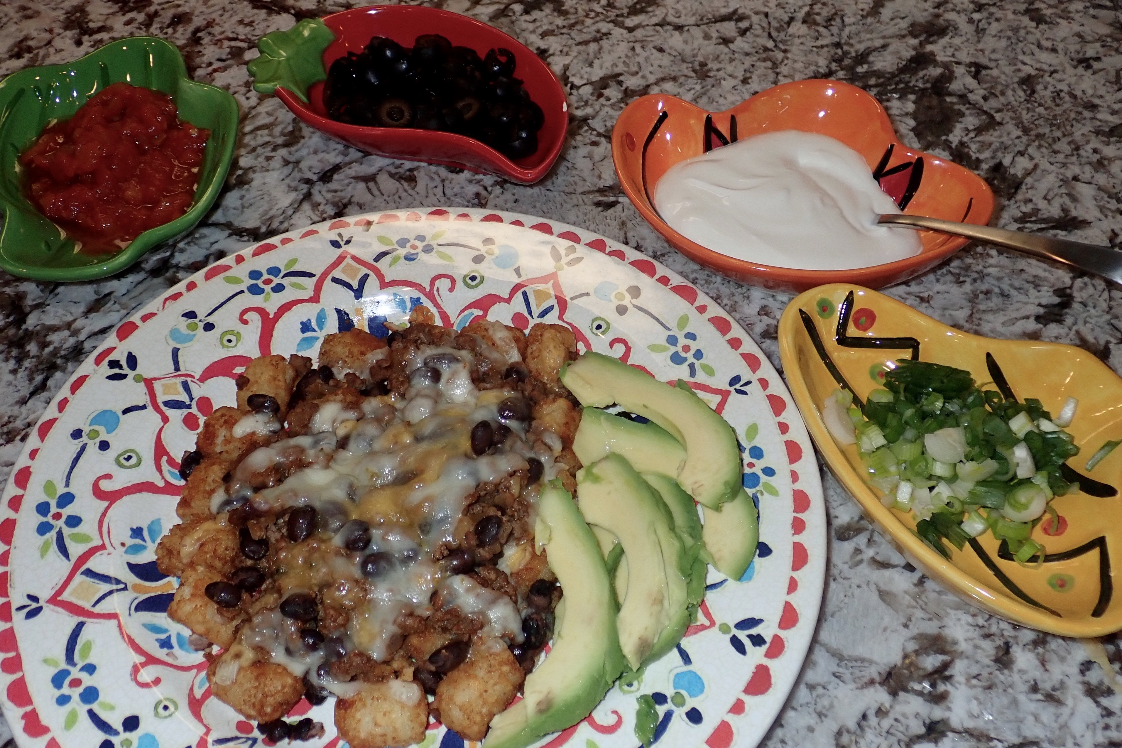 My favorite way to enjoy the Super Bowl is by myself with a great snack. This year, Totchos. Essentially fully-loaded nachos over tater tots instead of chips. Yum!