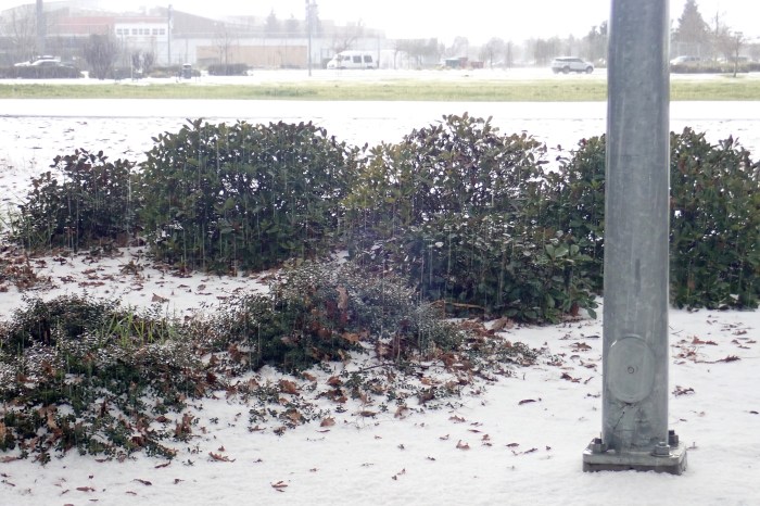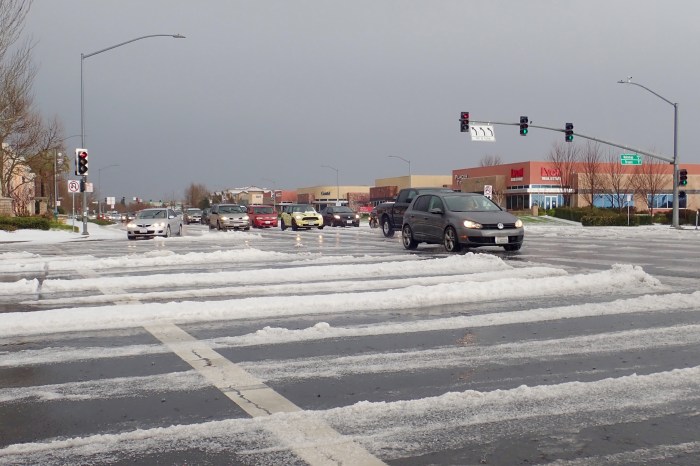 A rare occurrence: snow that stayed on ground for more that 24 hours. But was it snow? People who have lived in real snow country said it wasn’t snow, but rather hail. Others called it “wet snow” or “soft snow.” Sacramentans do not know how to drive in it, for sure.