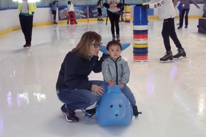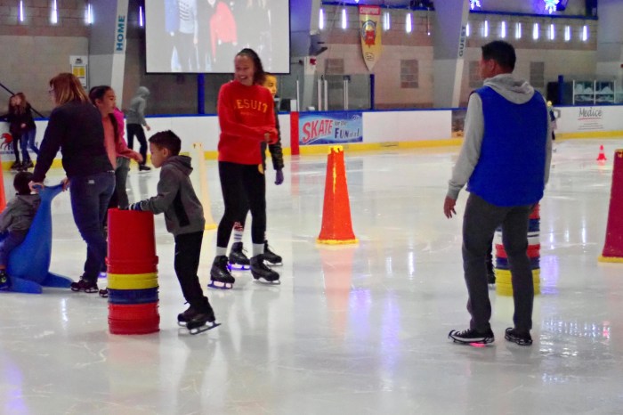 Overturned 5-gallon buckets are stacked to the right height for beginning skaters who stay at one end of the huge rink.