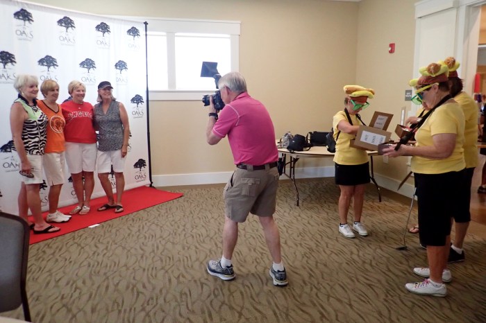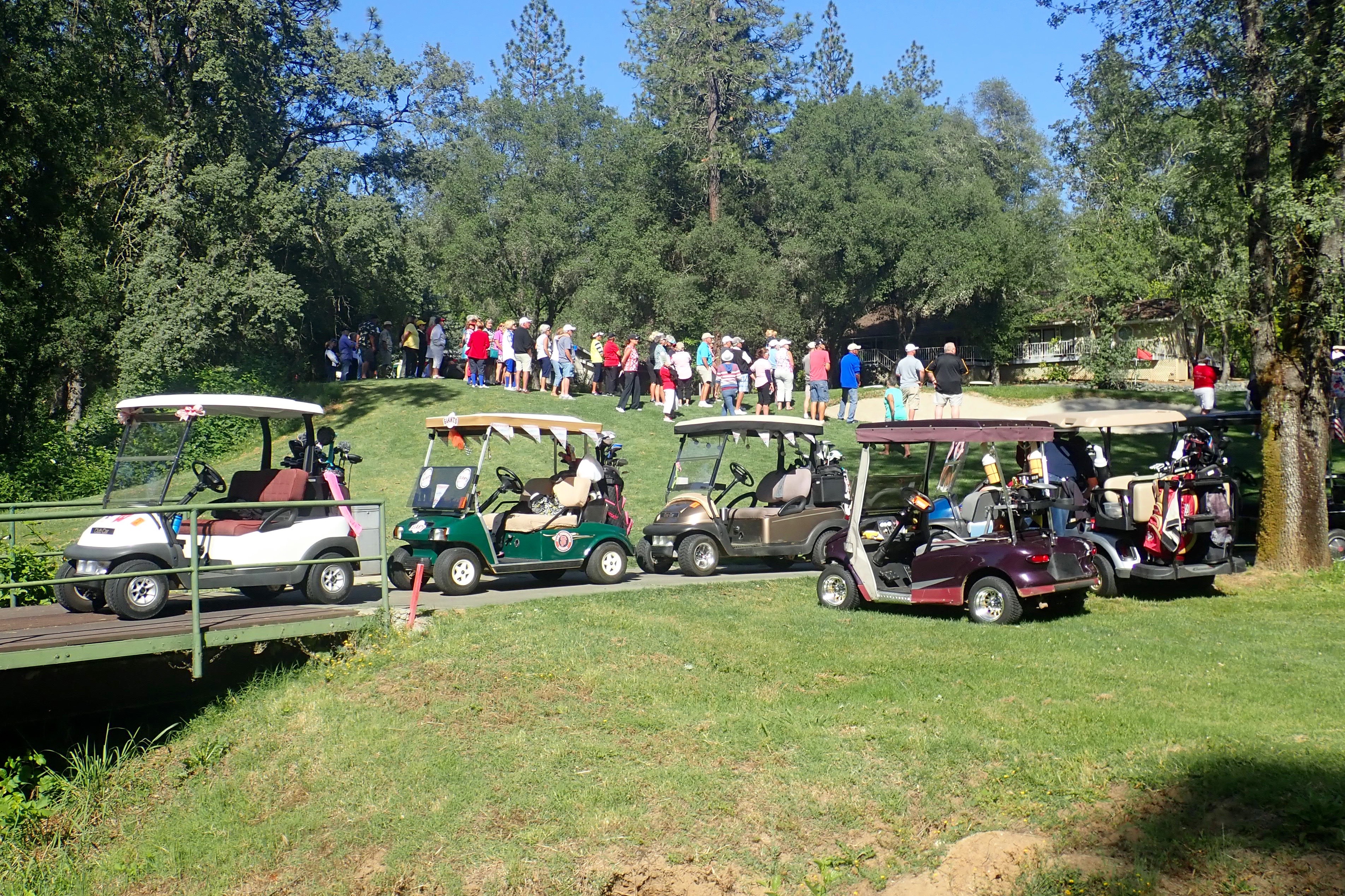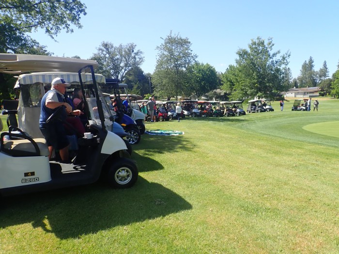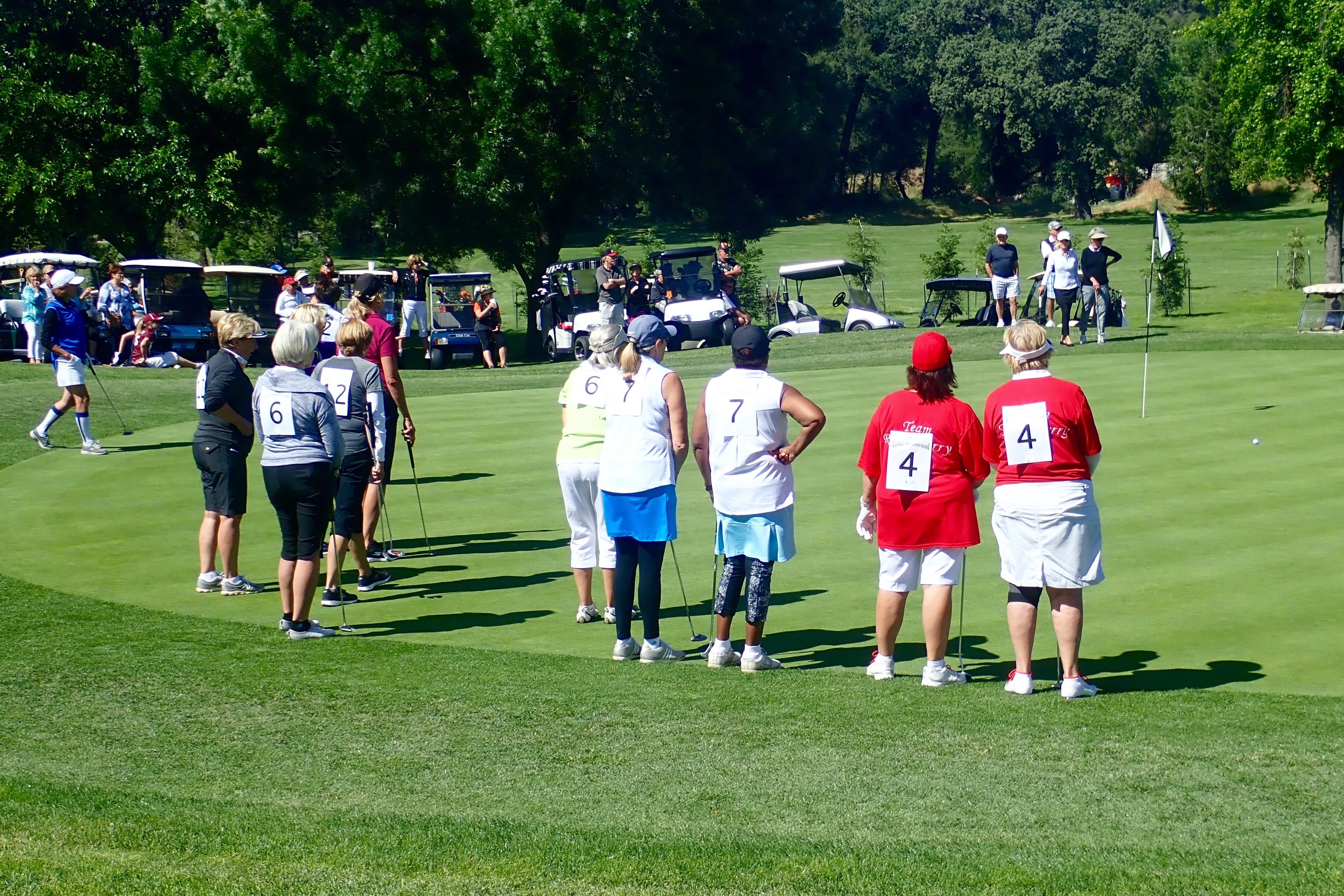 followed by lunch in the Cedar Room. Then came the very popular Filly Race. The top six teams from Wednesday’s 9-hole round played. Carts raced from hole to hole and lined the greens to watch them play 6 holes. Teams are eliminated after each hole.