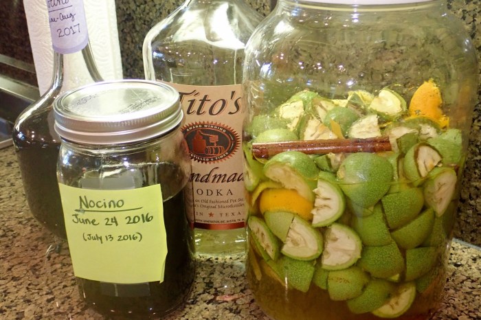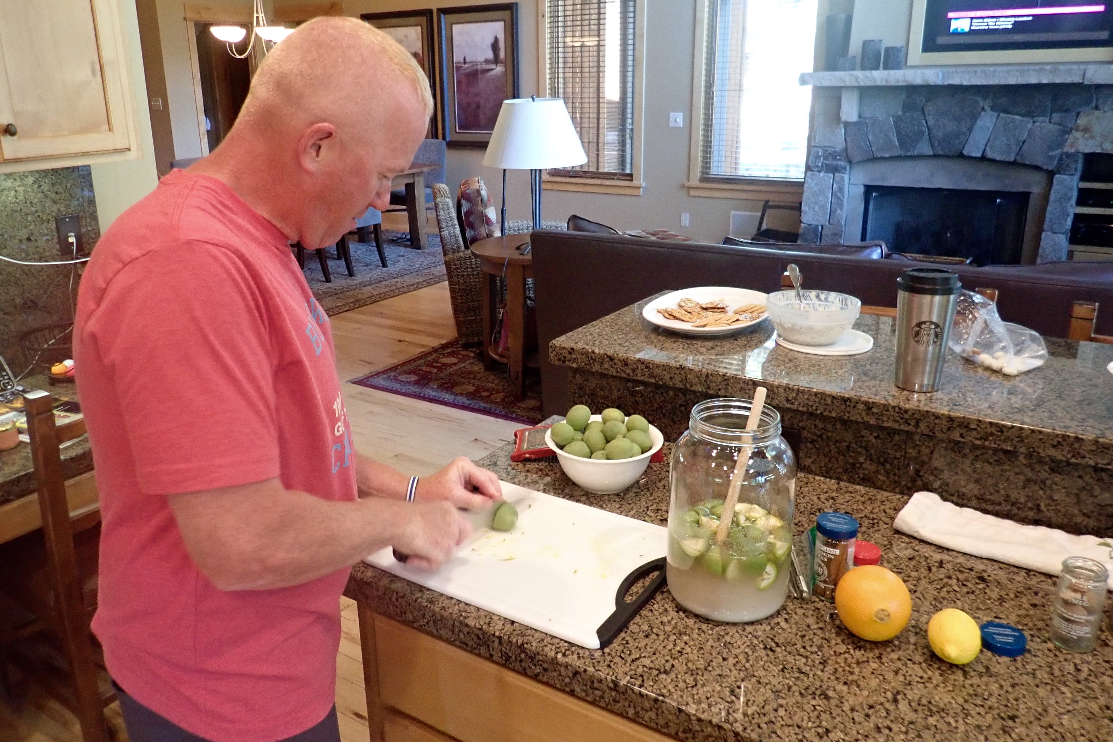 Making nocino. Thank you Mike for chopping the green walnuts into quarters: