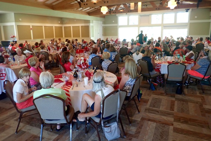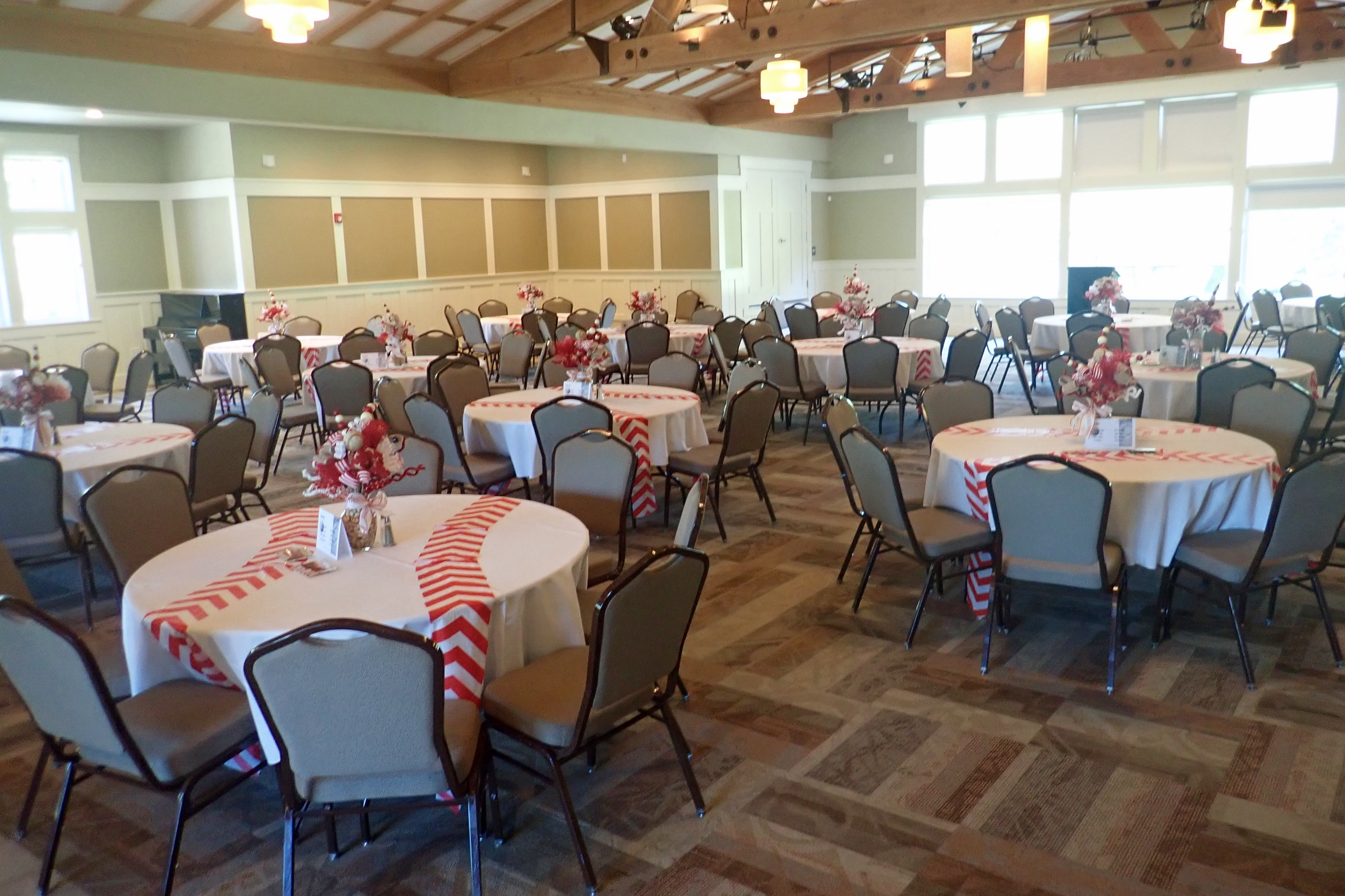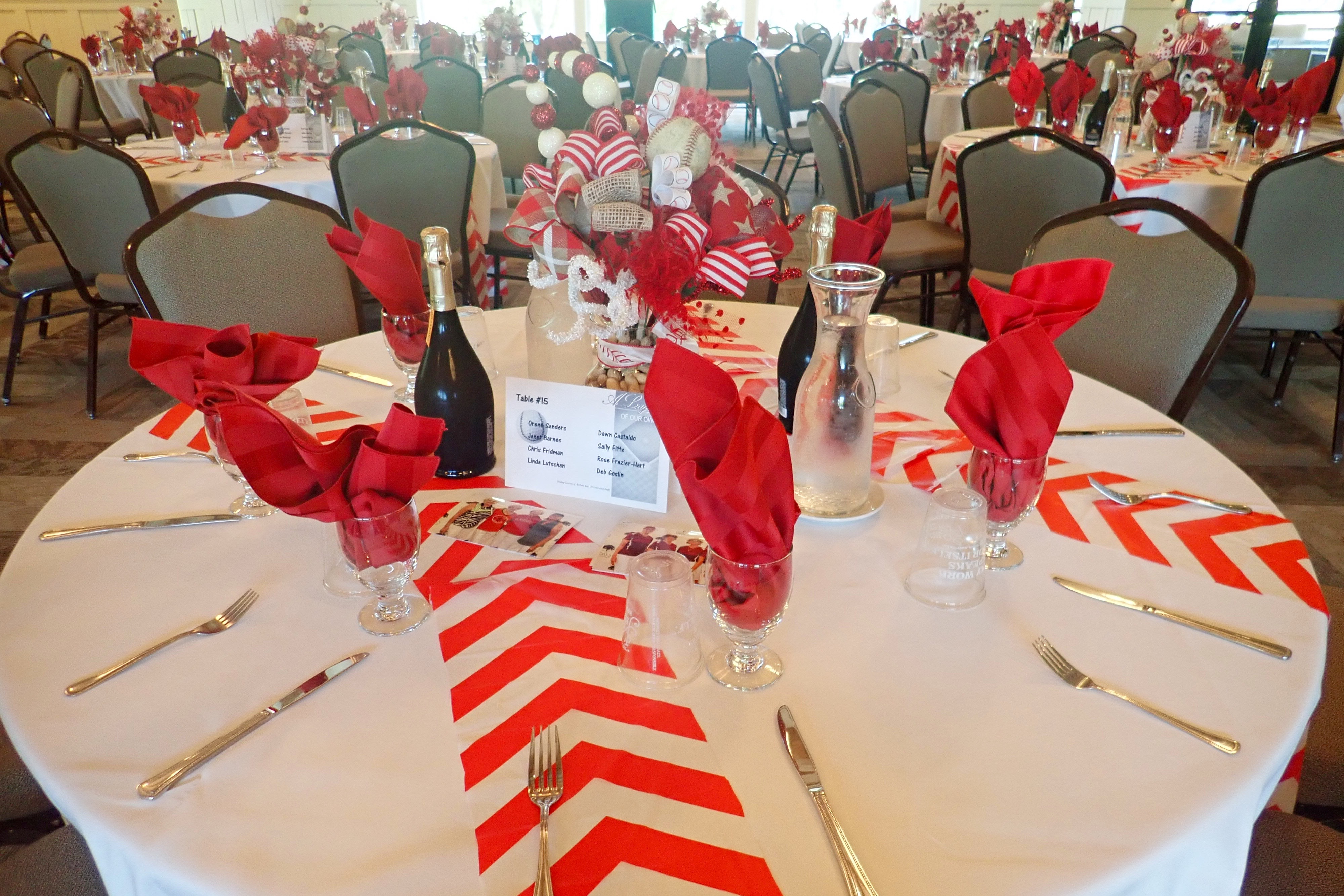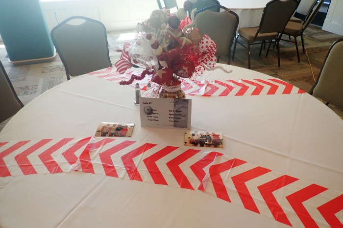 Well before the 2 pm lunch, I went to do some decorating for the awards banquet. The tables only had the white table cloths on them. I taped down a couple of darts in each strip of strip to look like the stitching on a baseball. One done, 14 tables to go.