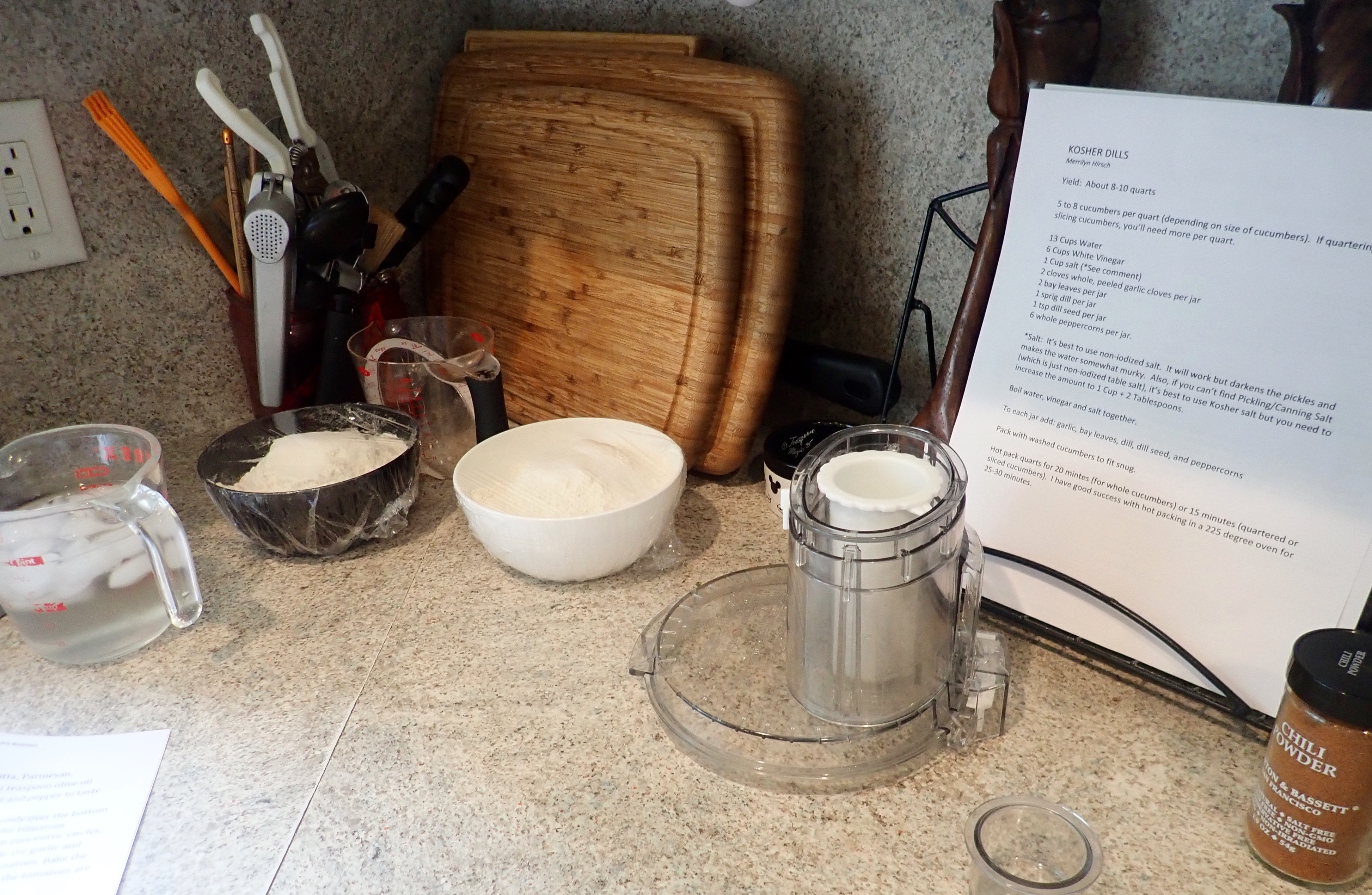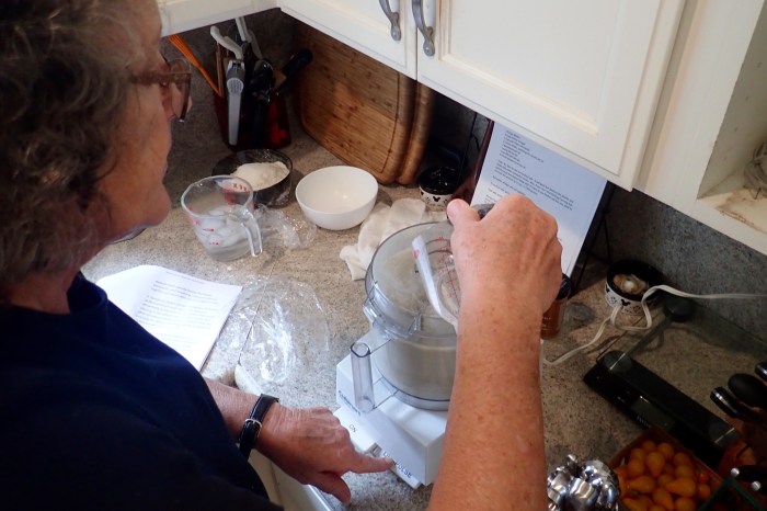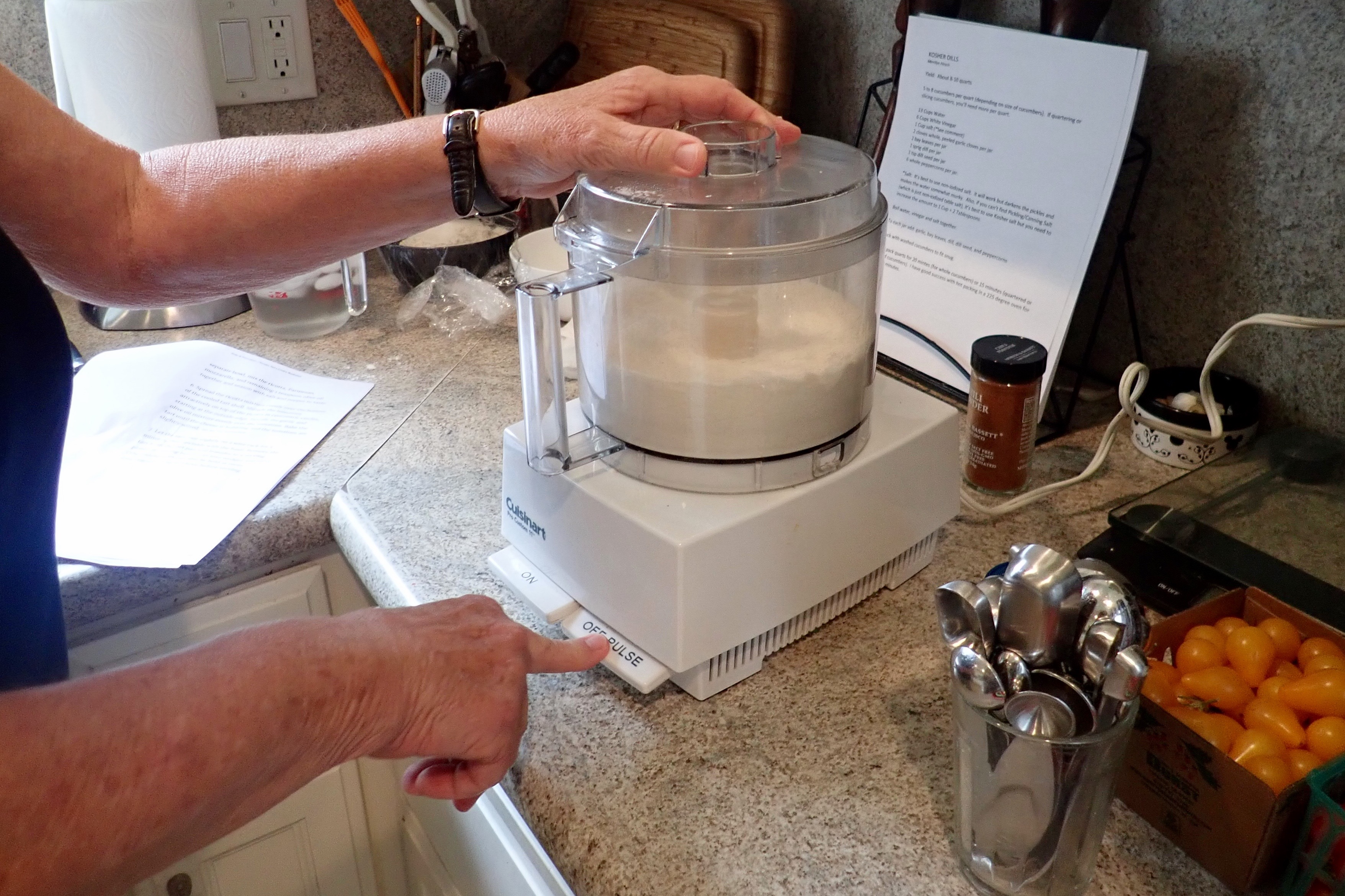 On Tuesday. The first time I tried to make pastry using my Cuisenart, it didn’t turn out at all. So I asked Merrilyn for a lesson today. Super-prepared as she is, all the ingredients were measured out and chilled as needed.