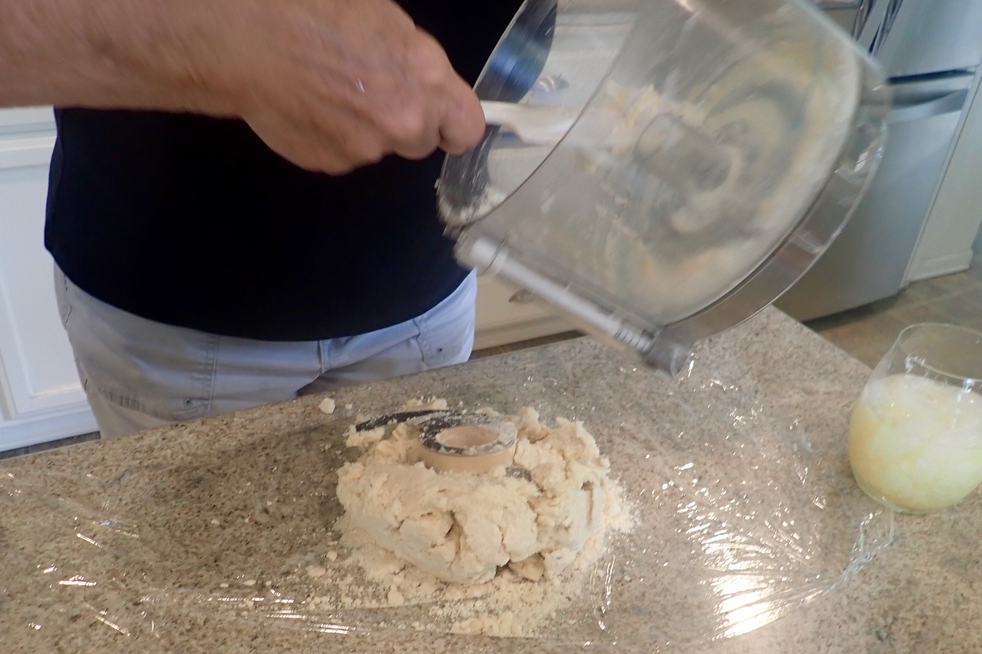 Stop! as soon as a ball begins to form and dump it onto plastic wrap. Divide in half and wrap each separately, let rest at least 30 minutes before using! Wa-lah! Two double-crust pastry doughs (doughs?) in about 20 minutes! Thank you, Merrilyn!