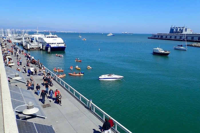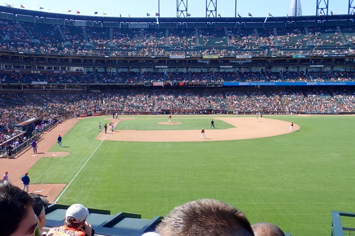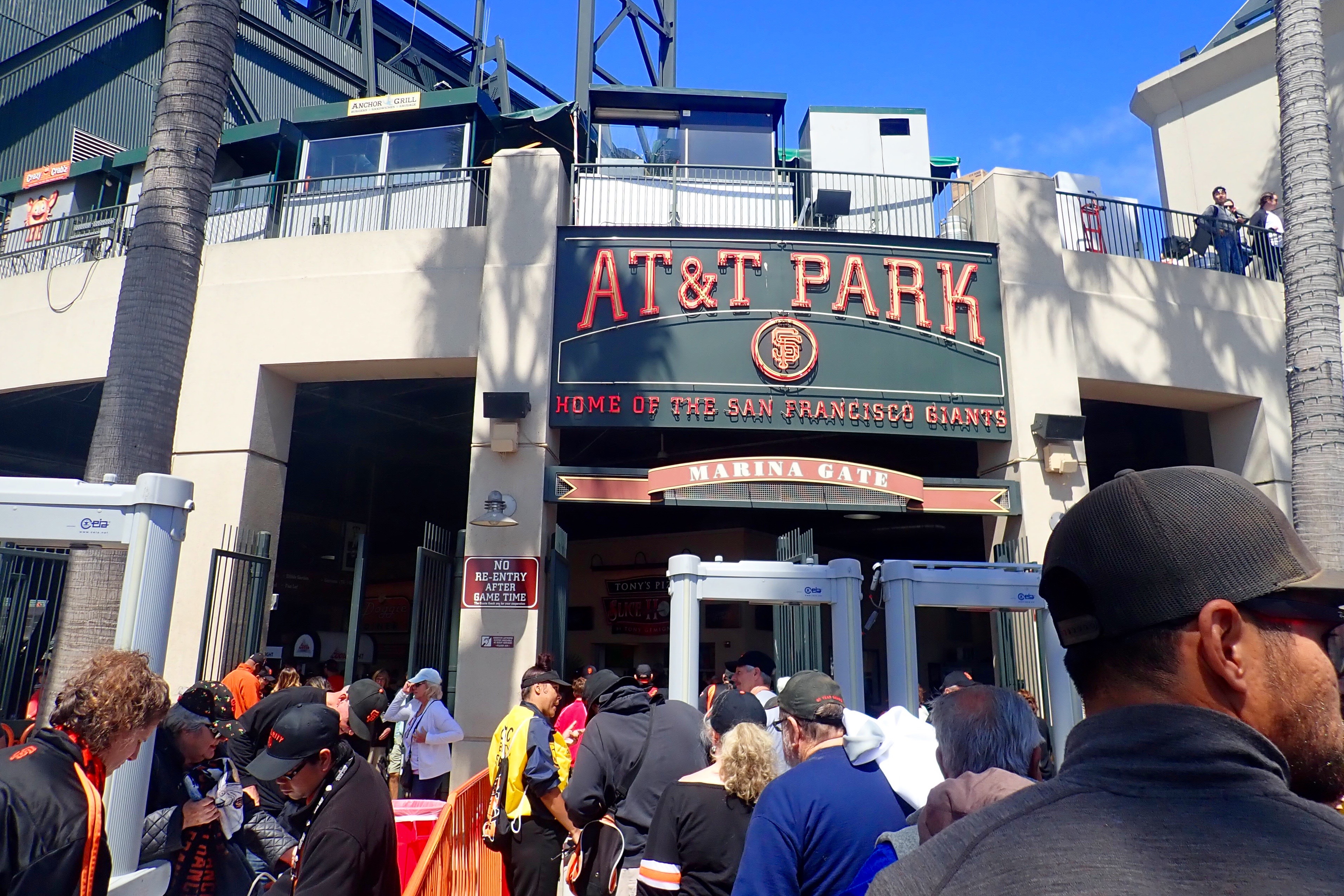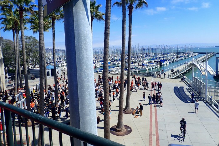 Ahead is McCovey Cove, a popular place to hang out during a Giants game, hoping to catch a home run ball.