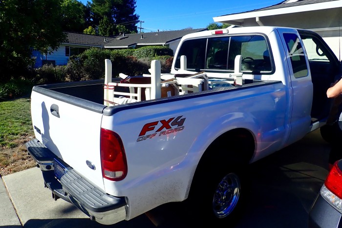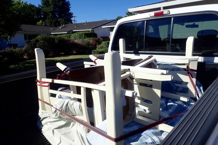 Yesterday, Adrienne and I loaded a table with a leaf, 4 chairs and a bench into the back of Justin’s truck. We used lots padding between the pieces, rethreaded a tie-down strap (whew), and used it to tighten everything down. Then we tied together pieces that still jiggled a bit using a method I learned from a sailor/lady in Mexico, “If you can’t tie a knot, tie a lot.” We were quite proud of ourselves.