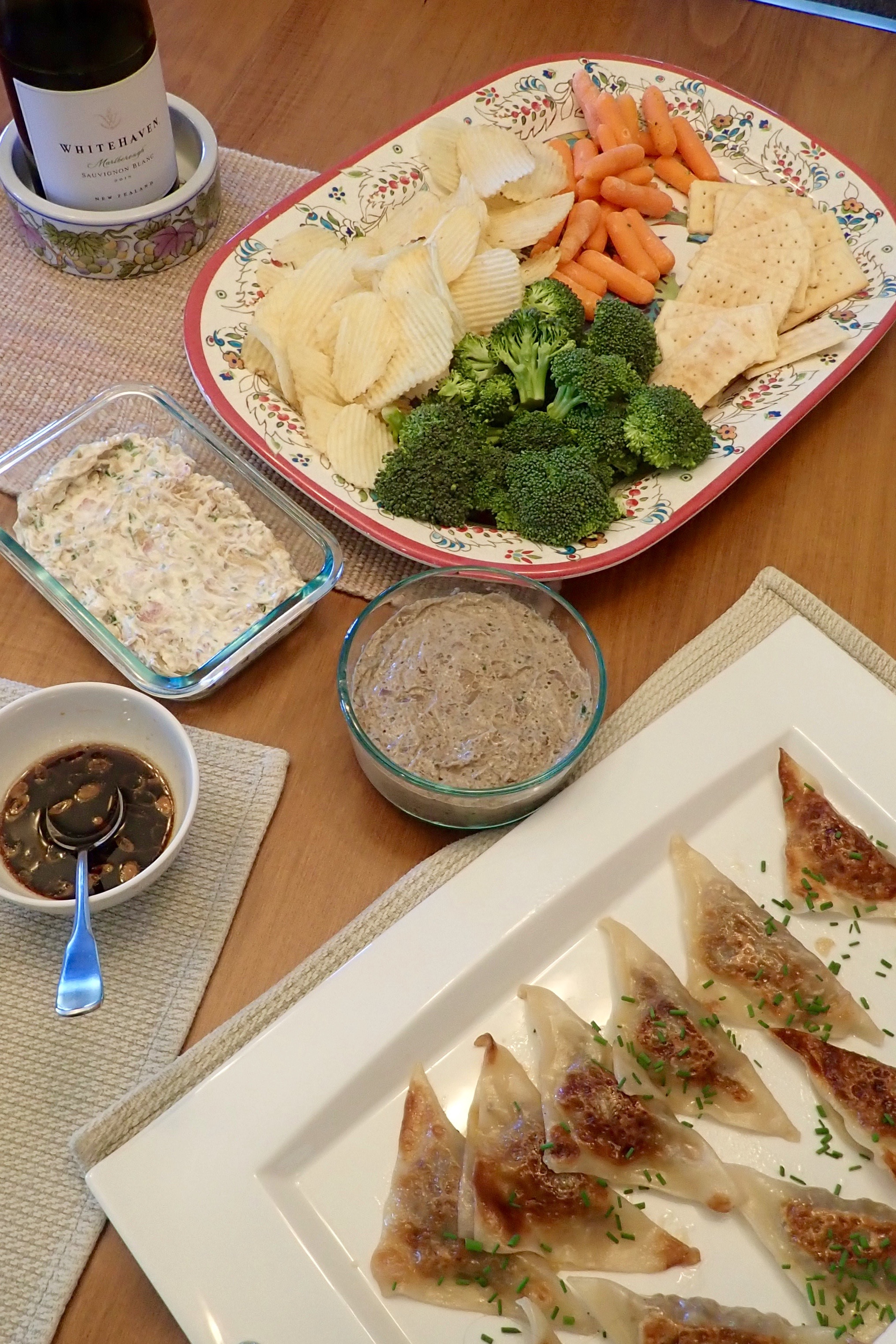 Meanwhile, great food, wine and company. We had Vegetable potstickers; and Carmelized onion and bacon dip, Mushroom pate with crackers, chips and vegetables.