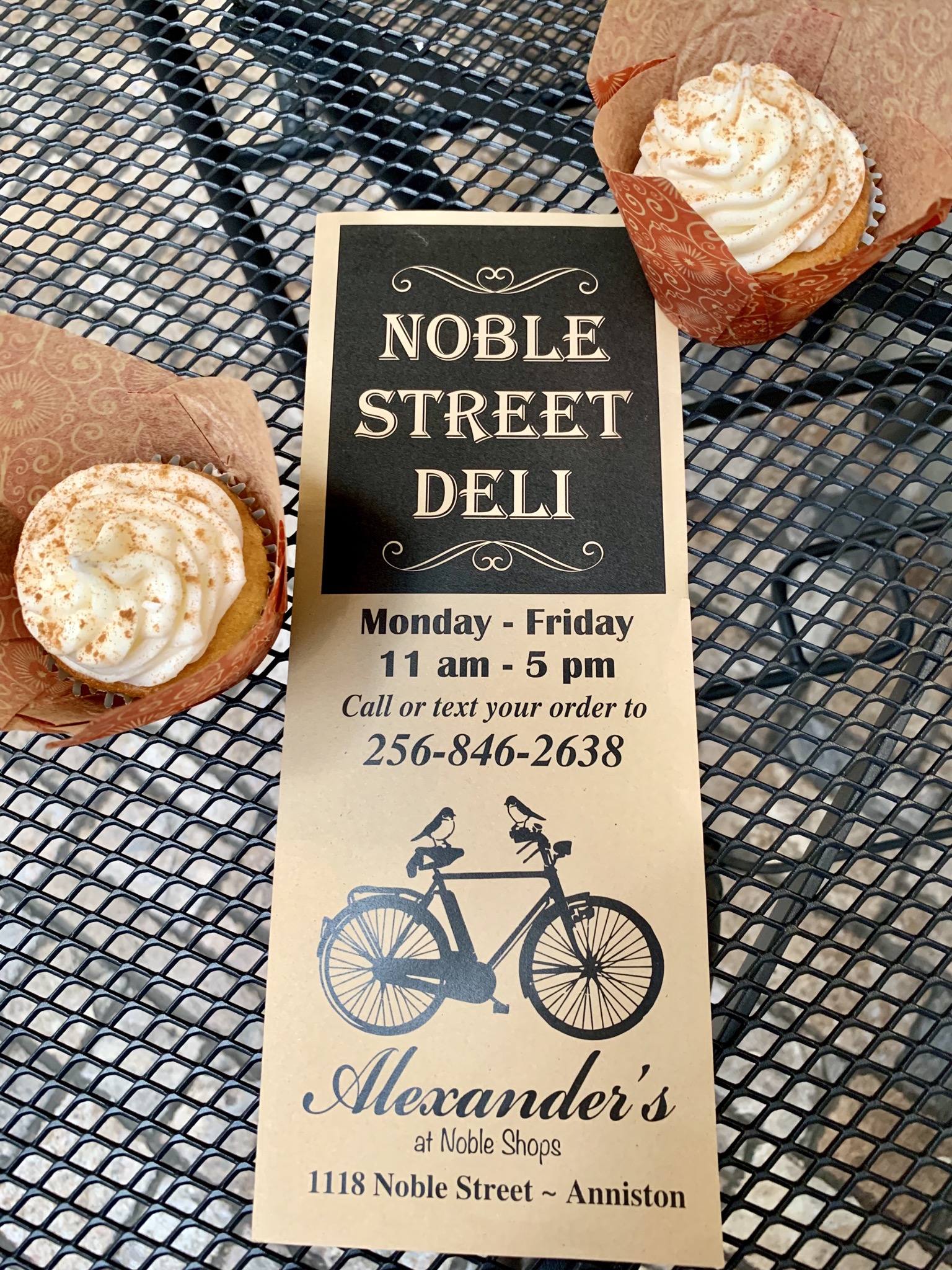 We walked around downtown Anniston today and had lunch at Noble Street Deli. Peach cobbler cupcakes came with our meal. Yum!