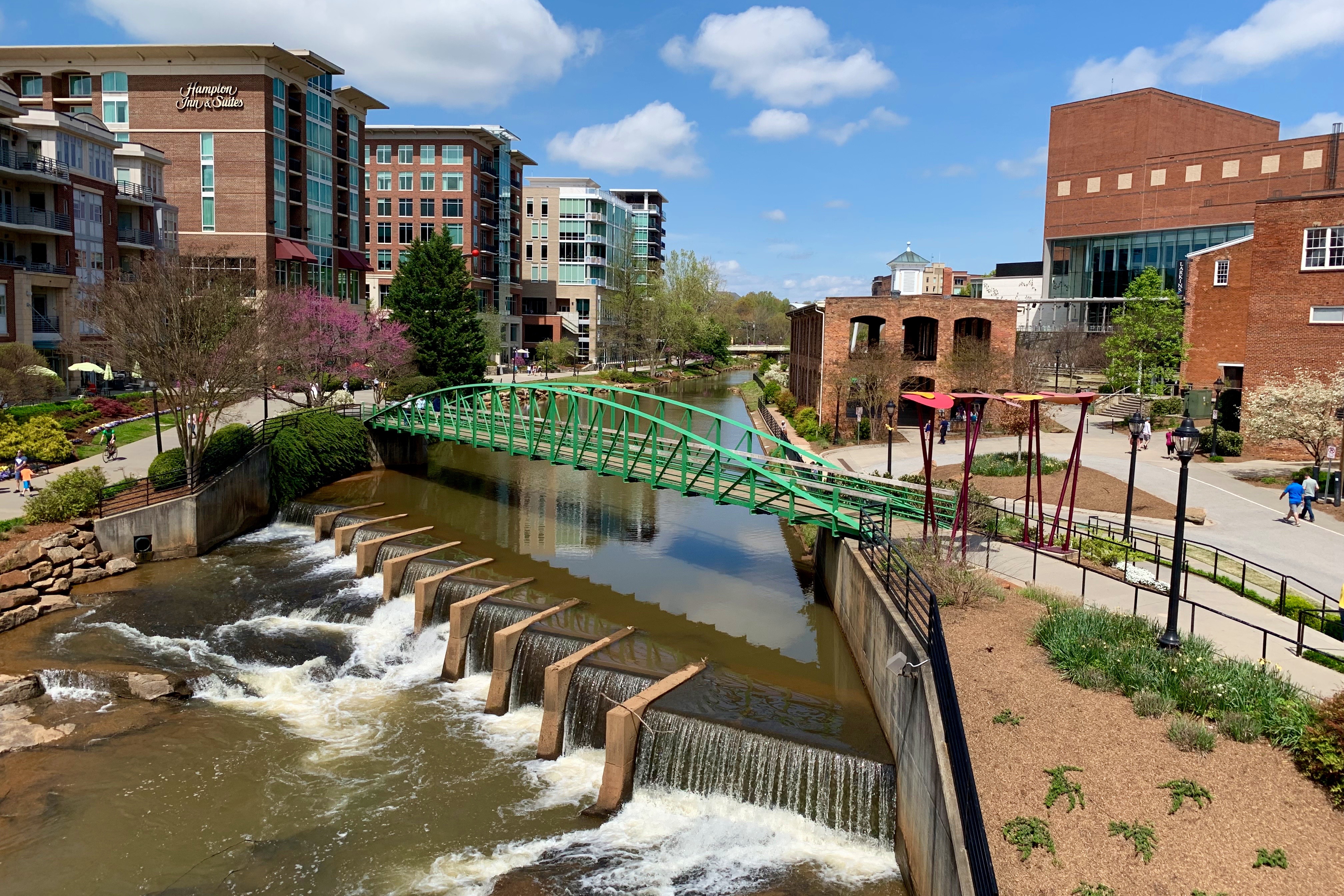 Even though neither of us totally finished any of the breakfasts, we are stuffed. Happily stuffed! Time to walk it off with a stroll down Main Street to Falls Park on the Reedy: