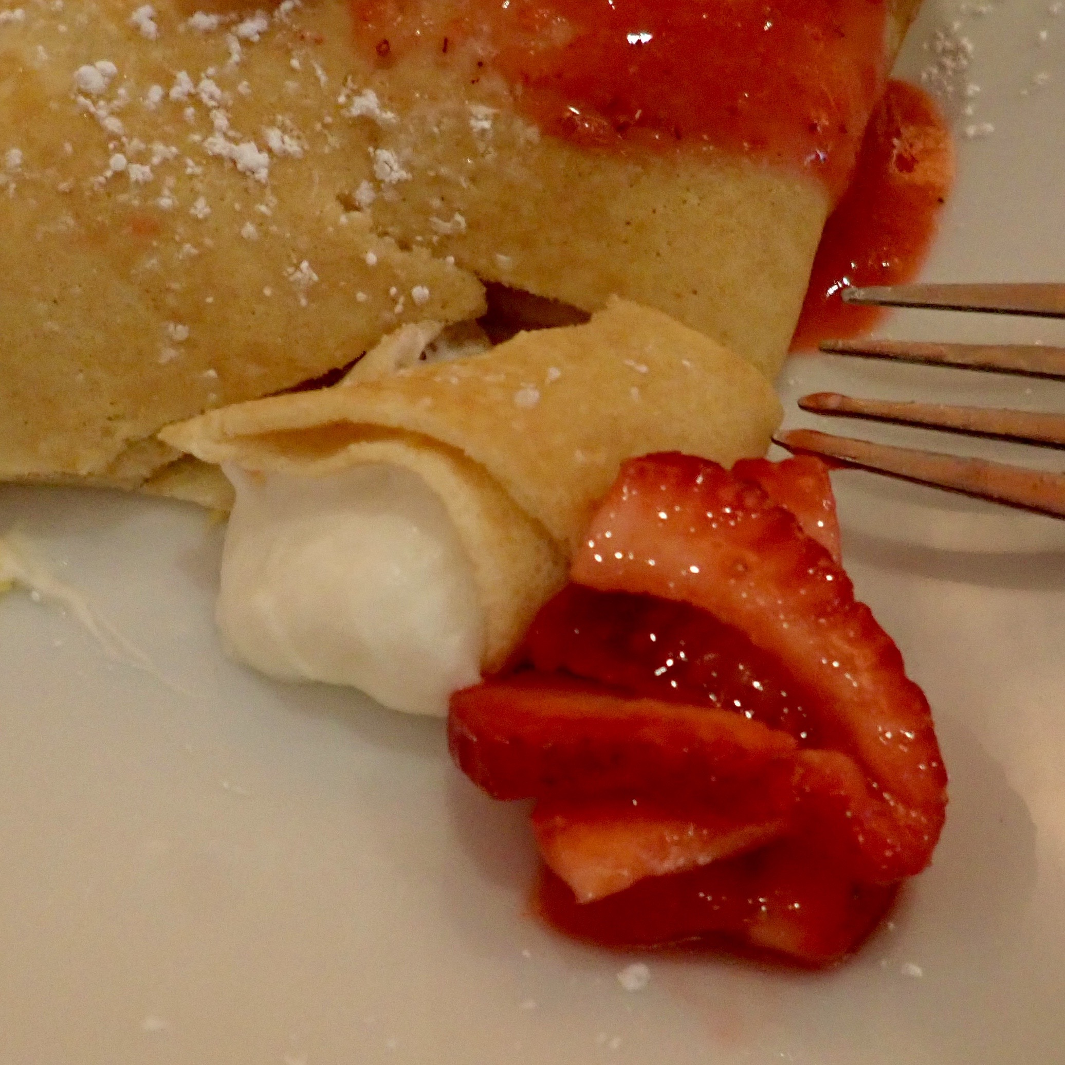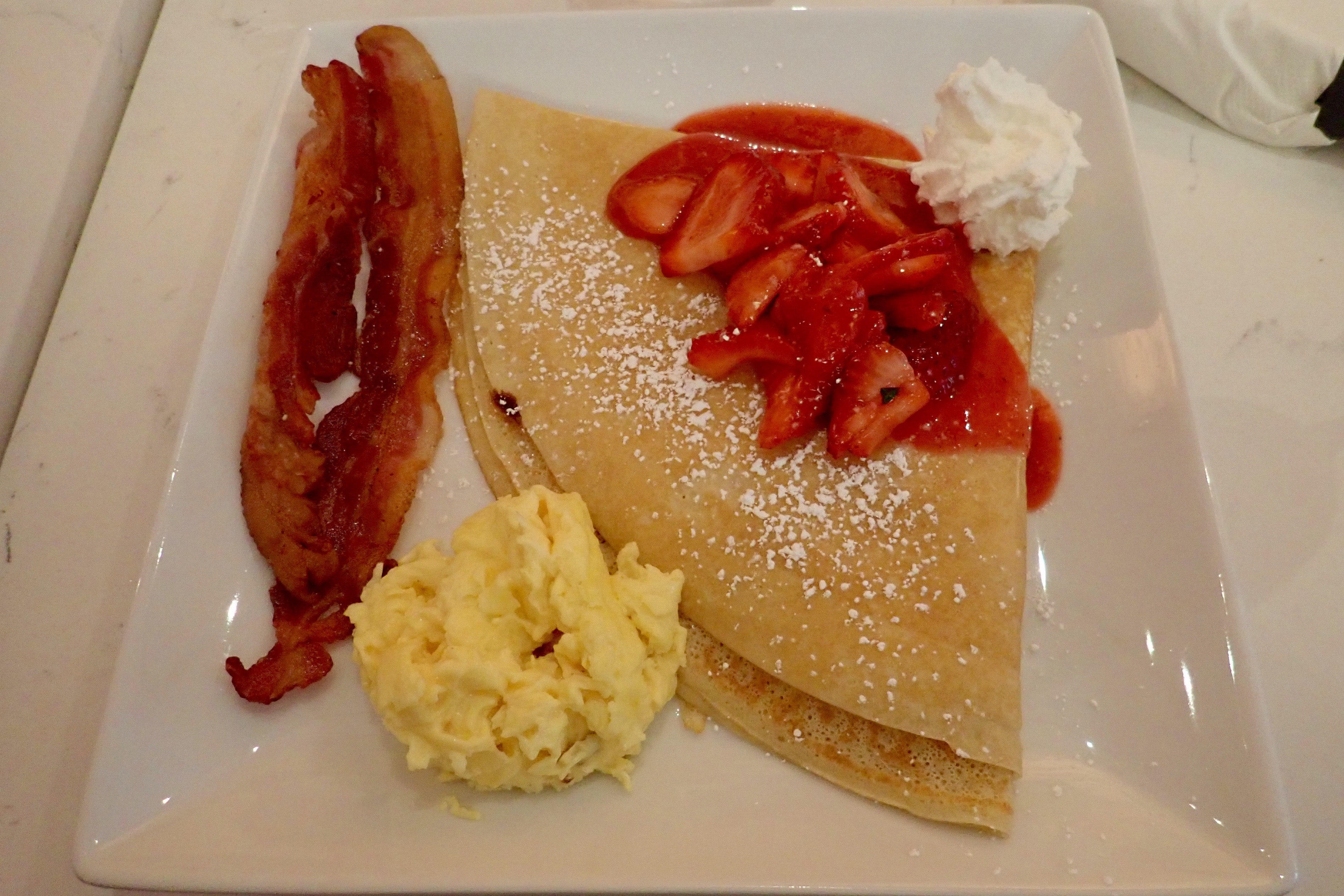 Mimosas, bacon, scrambled eggs, and a beautiful crepe! The filling was delicious but we couldn’t quite figure out the flavor.
