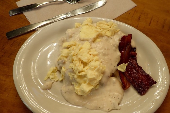 Biscuits and sausage gravy with scrambled eggs and bacon.