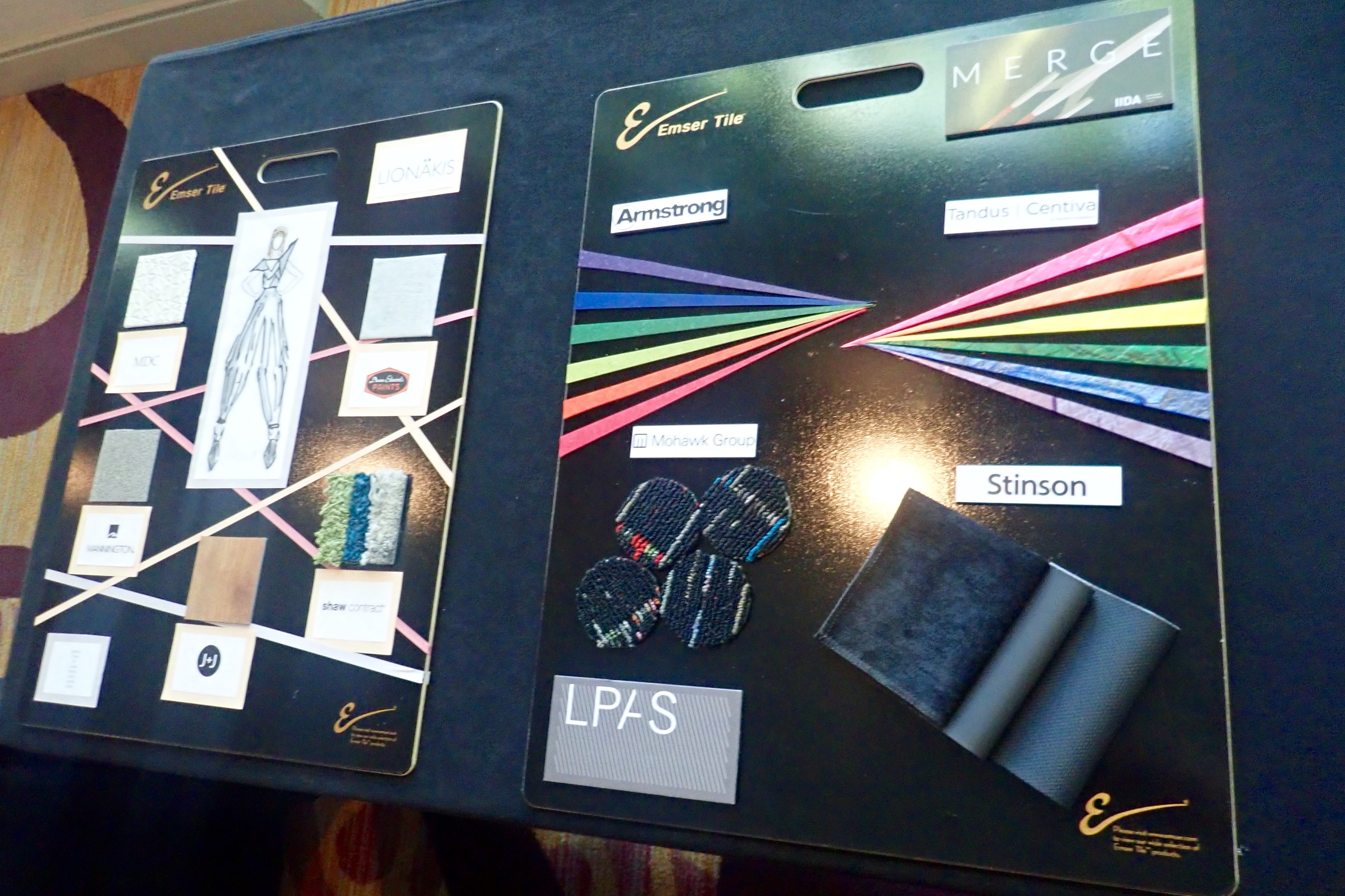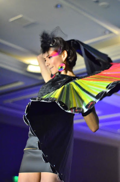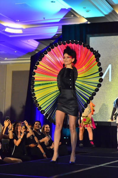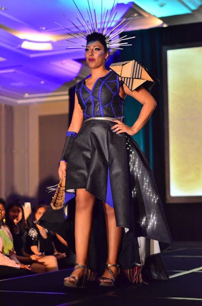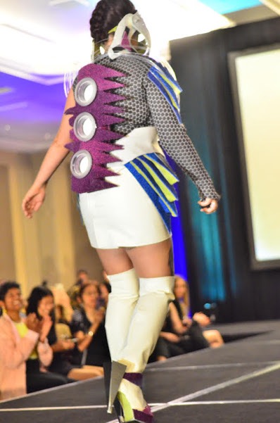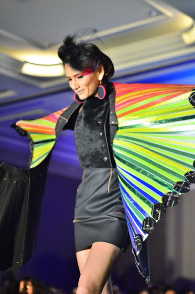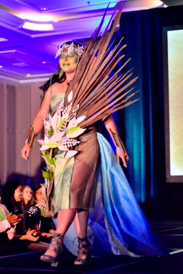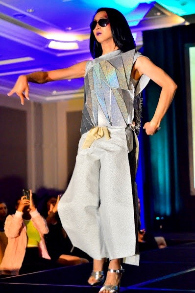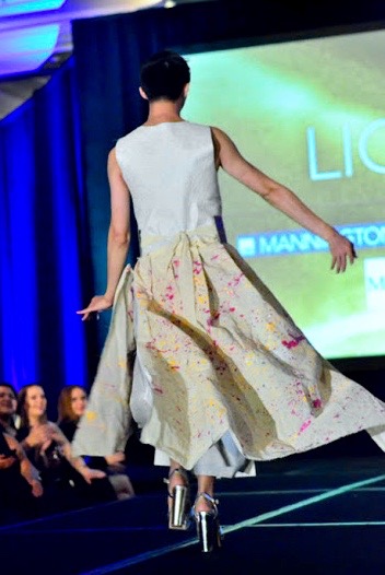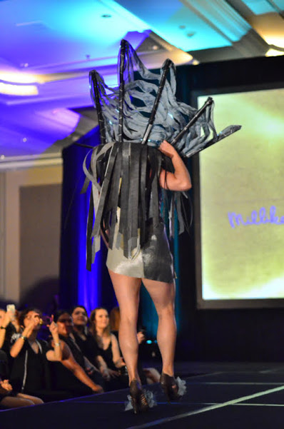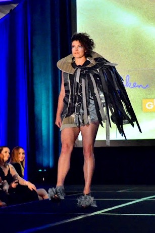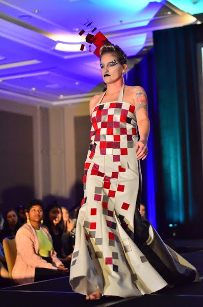A “Creative Collaboration Event” where local designers from the top architectural and interior design firms in Sacramento turn architectural materials into fashion. Over the past two weeks, 13 teams have designed and created wearable fashion from plastic laminates, carpet, textiles, paint chips, wall coverings, tile, etc. Tonight one model from each team walked down the runway in the ballroom of the Hyatt Regency Hotel.