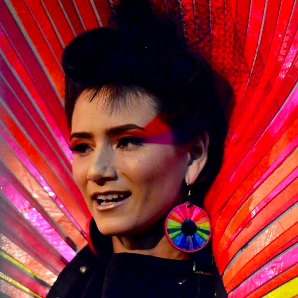 A close-up of the earrings, made by Heston who also cut all the vinyl flooring pieces on a band saw.