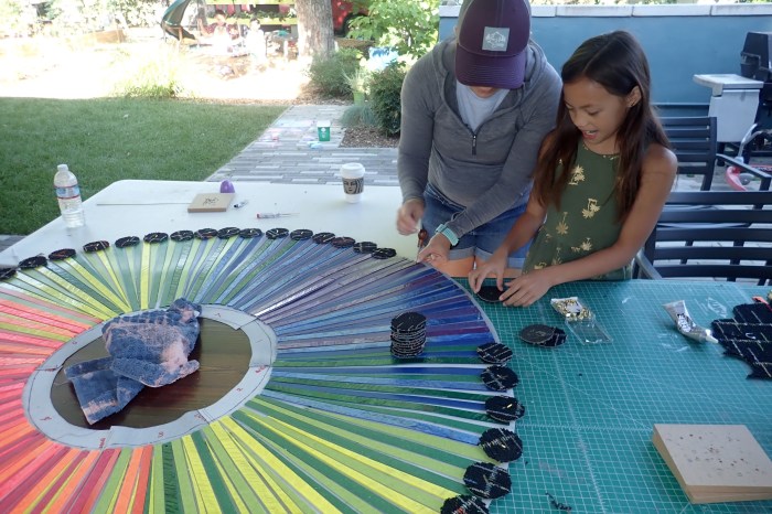 More triangles of vinyl flooring were added and the carpet circles were attached with brads.