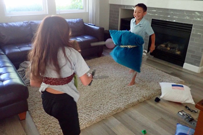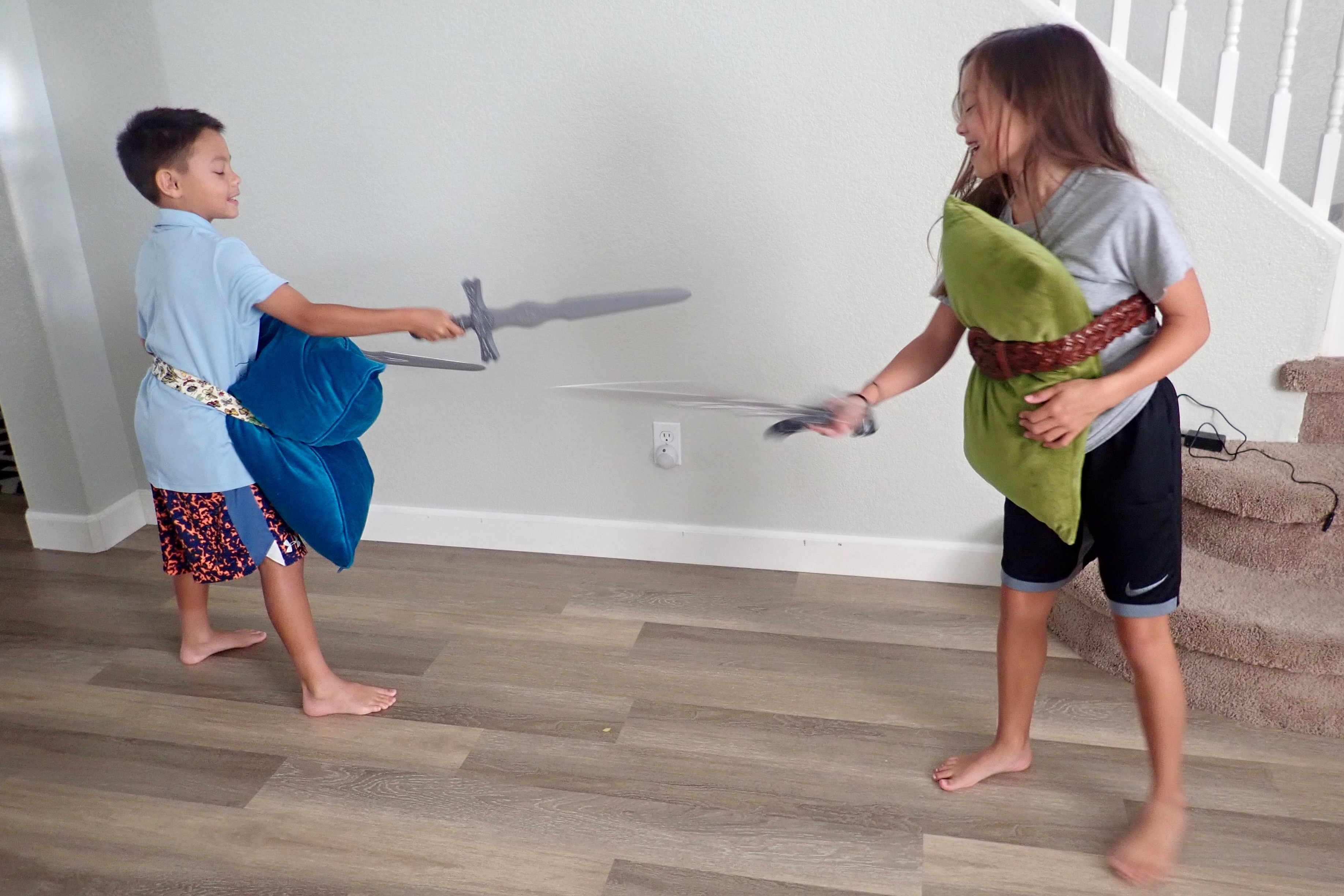 A couple of times this week, I picked up Avery at St Ignatius then drove to St Francis to pick up Sophia from volleyball camp. After stops at their favorite fast food places, both were content with just hanging out at home for the rest of the afternoon. When Thais got home from work and I was getting a bar stool out of my vehicle, I found a couple of plastic swords. I needed help assembling the first bar stool and asked Thais for help. Meanwhile, Sophia and Avery got busy with pillows and belts. A really good sword fight was coming.