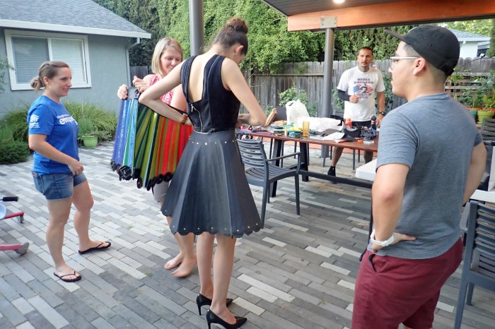 The last evening to make final touches. After I whip-stitched the facing onto the waist band, other team members poked holes and added brads.