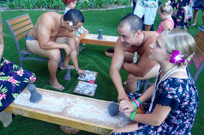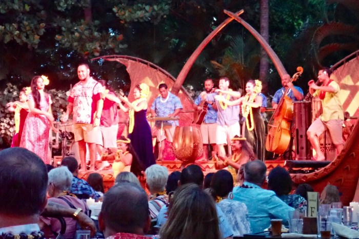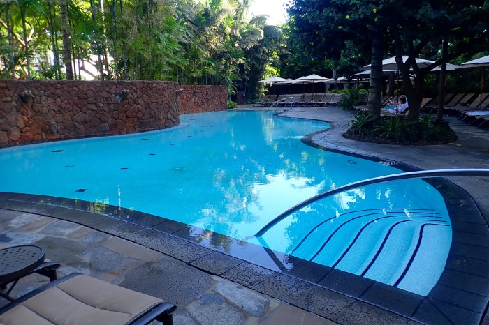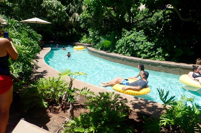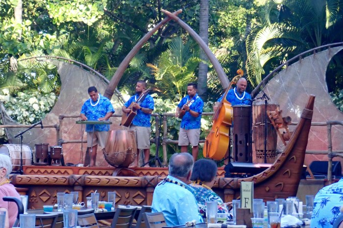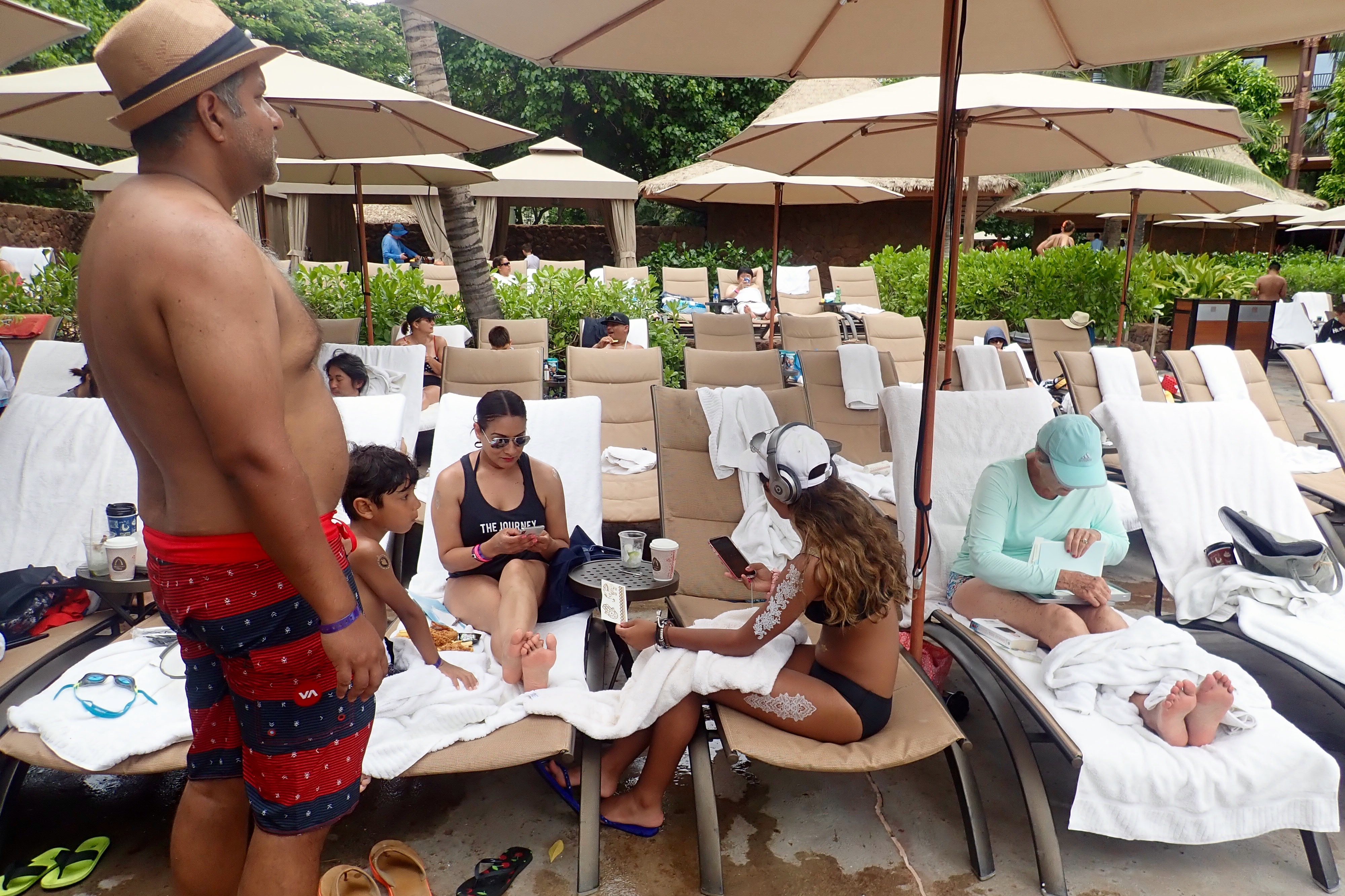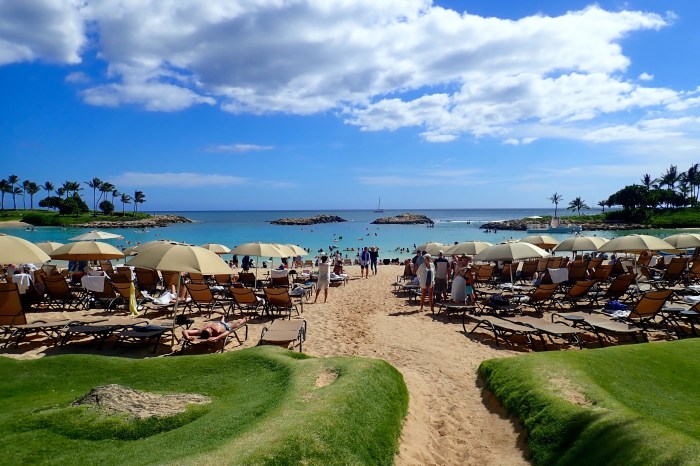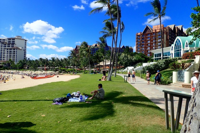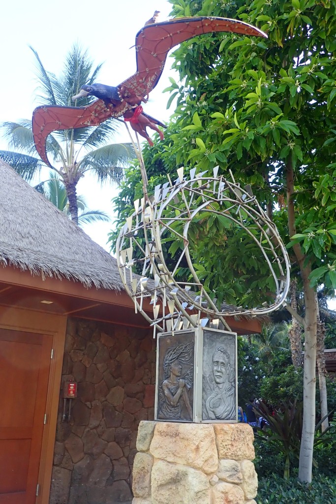 In the morning, we went across the street to check out some shops. While we were having lunch, we met a Disney cast member, Michael – nice young man – among his duties is being a Japanese translator. There were LOTS of Japanese guests. He shared that there are only 300 chairs around the various pools so getting them and keeping them can get competitive. (Another factoid: Aulani staff launder 2300 beach towels every day.)