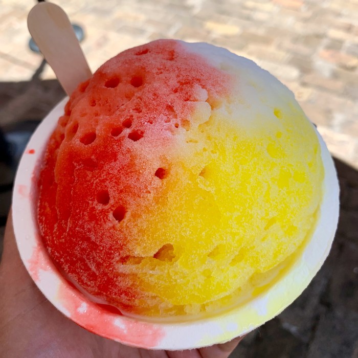 Mac nut ice cream on the bottom, then packed with shave ice and drizzled with 3 flovors.