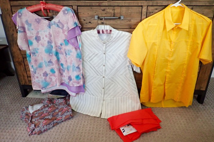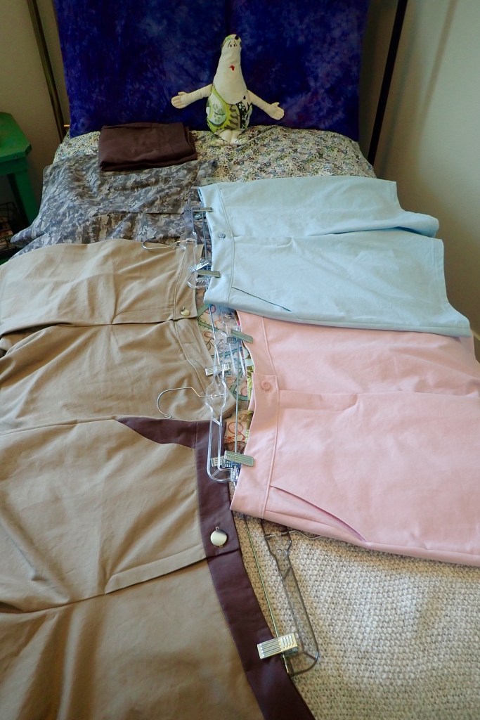 The first pair in dark brown denim (folded) were too big 😦 then came the camo and khaki shorts. The khaki with dark brown meant I was running out of those fabrics – but at least the shorts fit. The real goal was to use the pink and blue denim. That was done. The I began obsessing about tops – I got mixed results in that department which is frustrating because I’ve been sewing for 60 years. How can I screw up so often? The results: