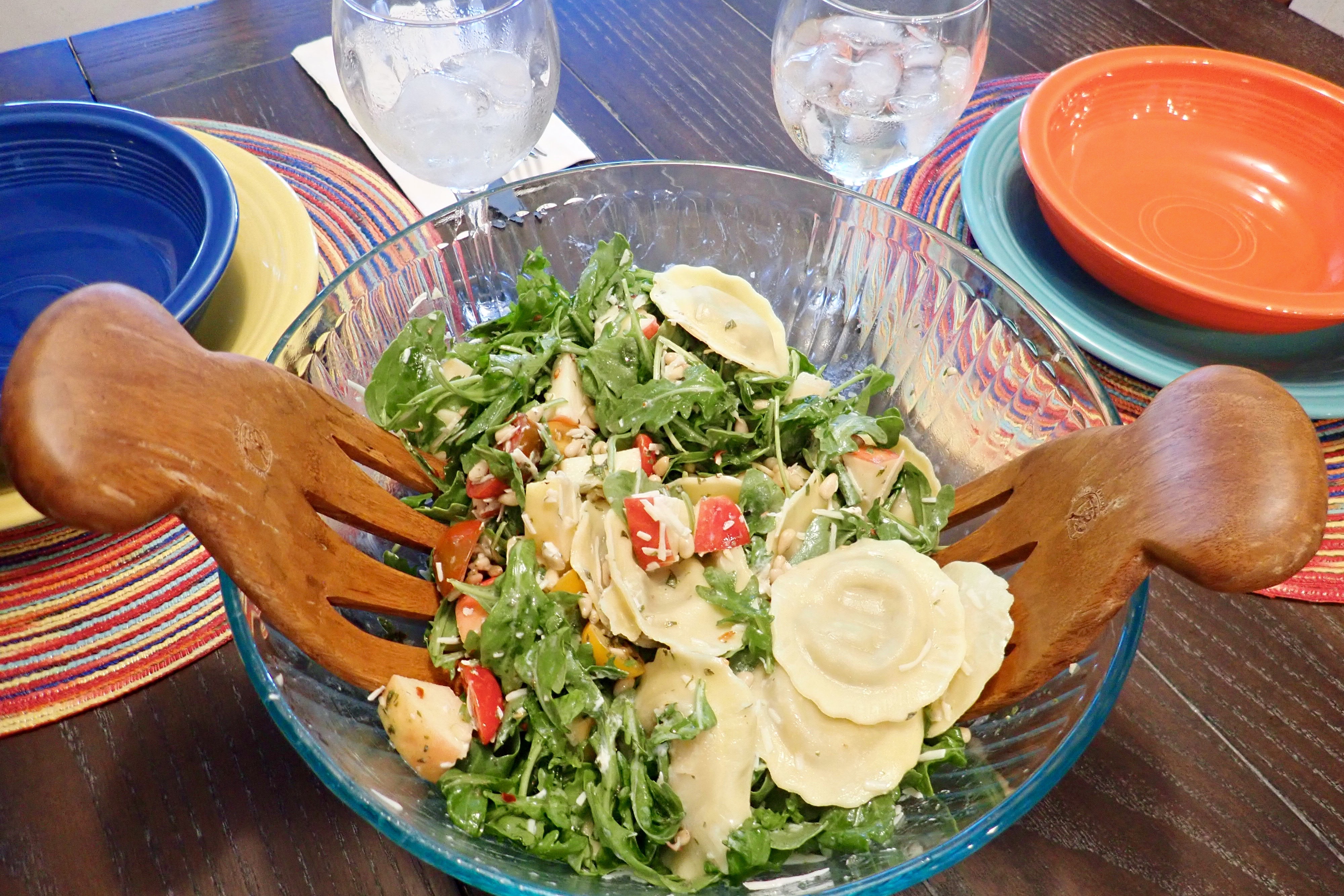 This afternoon, I went to Ade’s house to watch the rest of Big Little Lies. I made dinner, but a recipe I’ve never made before. The ingredients were diverse and I really wasn’t sure it would be good at all. Warm ravioli salad w marinated cheese, apple, and tomato – the greens were arugala.