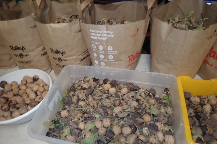 My walnut processing “factory” in the garage was humming this week. The gathered walnuts are a mix of perfect walnuts, imperfect walnuts, and debris – all that needs to be sorted. I poured a half bag into the shallow plastic box each time. The perfect walnuts went into the white bowl which was then dumped into a bag until it was almost full. The imperfect walnuts went to the right and were dumped into a separate bag – I may just throw these away in the end. The debris left in the plastic box was dumped into a third bag.