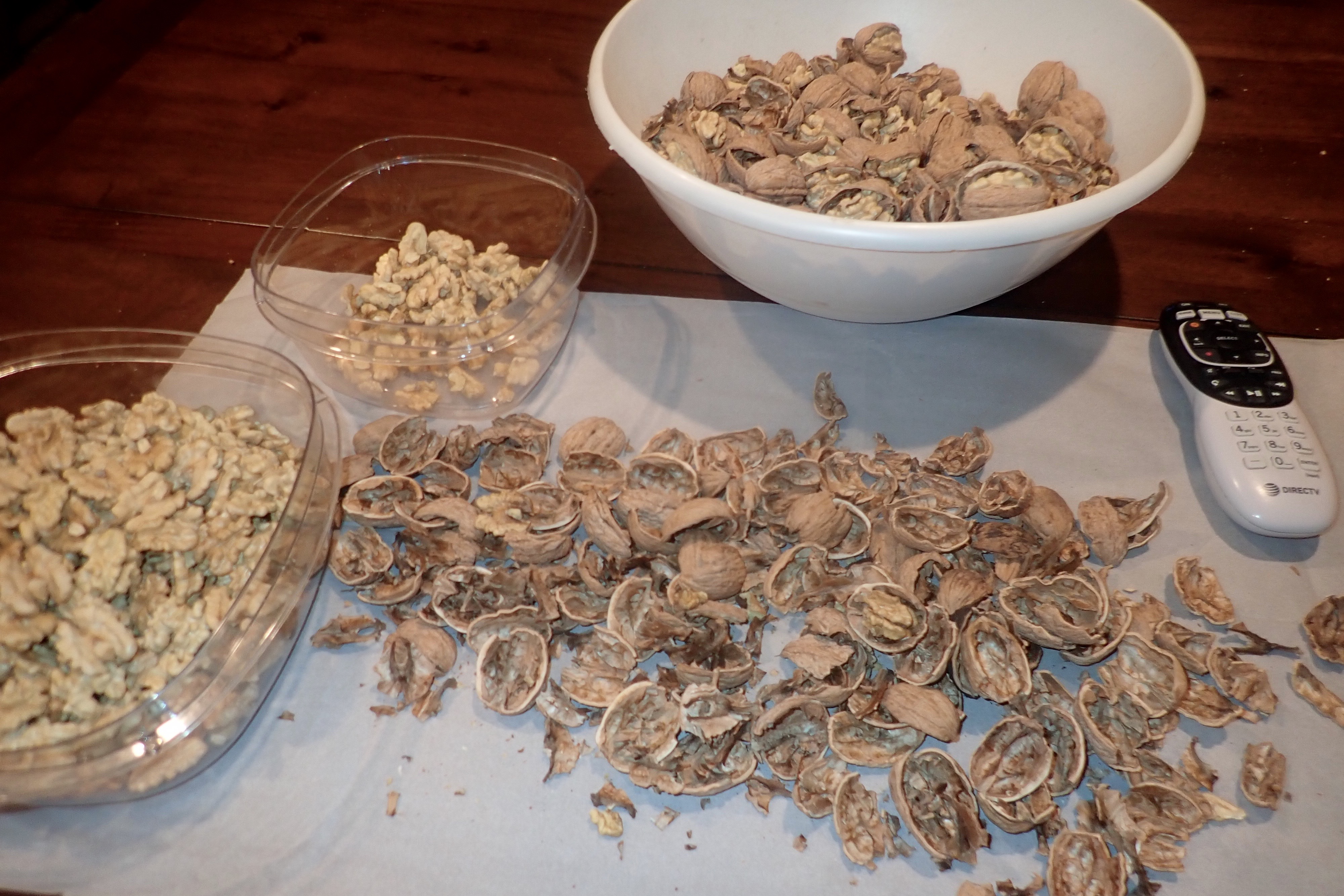 The perfect walnuts then get weighed, 12 pounds per bag, and put on shelves. I’m at 439 pounds with lots to go. The other garage activity was cracking a bowl (after bowl after bowl) full of the perfect walnuts,