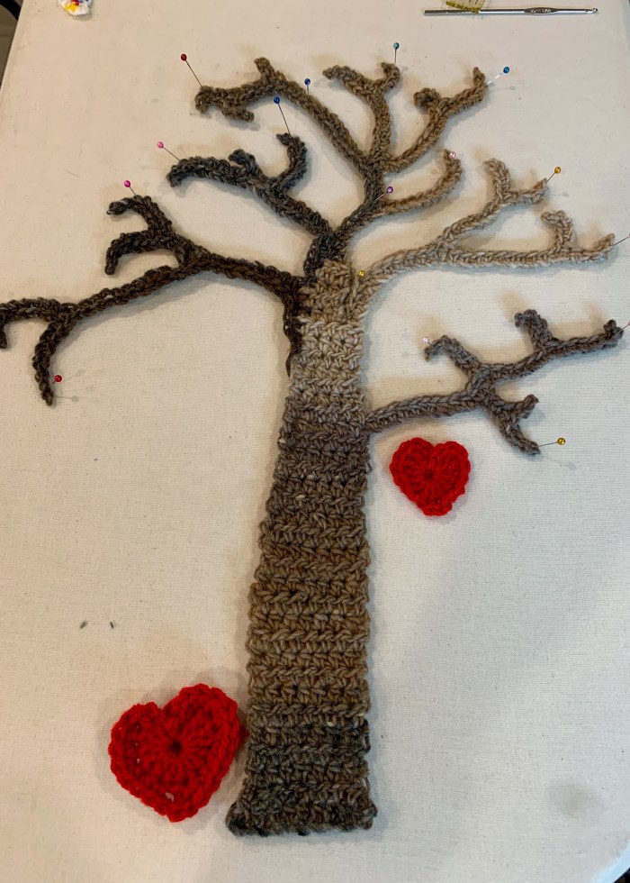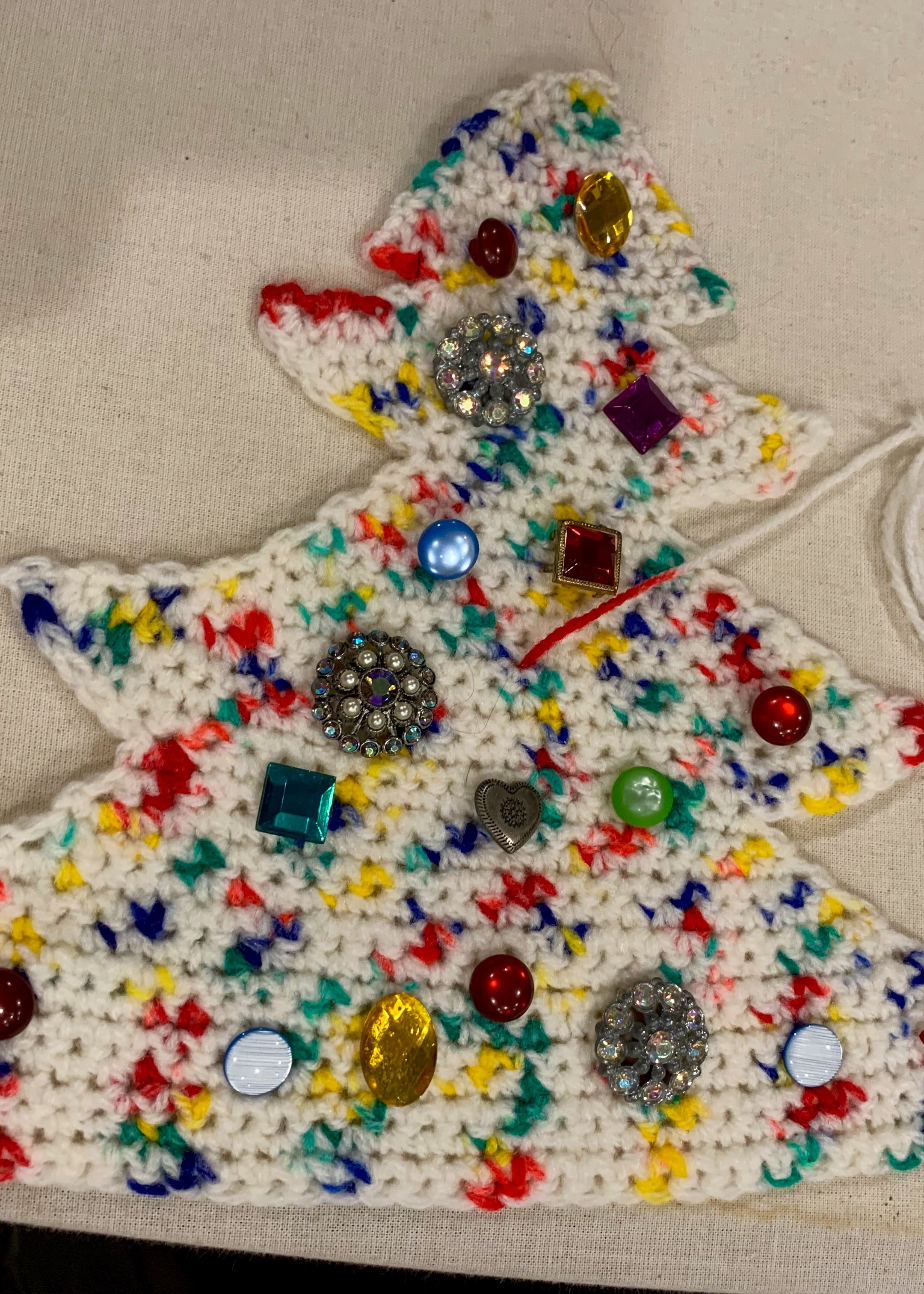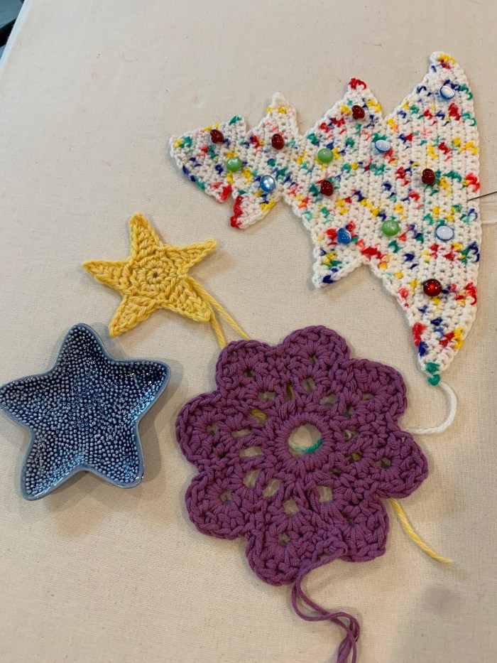When I was in Deer Lodge, I looked at lots of Phyl’s crochet pattern books, looking for inspiration. I practiced with a bit of yarn, a hook, and a basic instruction book. When I got home, my neighbor Kathie gave me some leftover yarn from her finished projects and I kept looking online for something interesting.