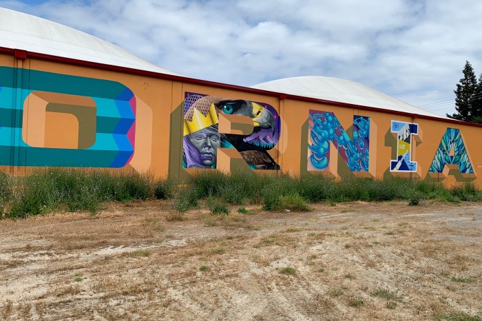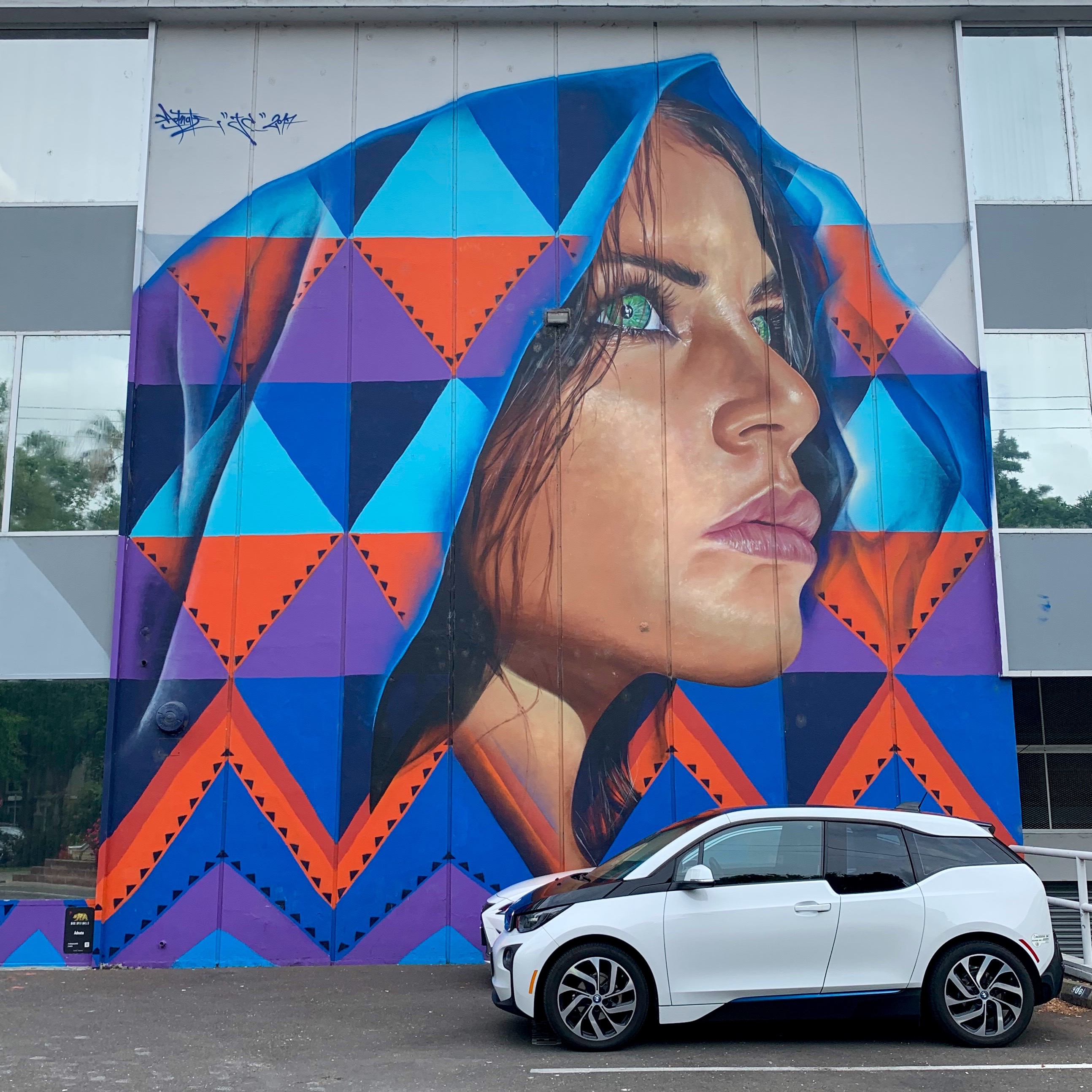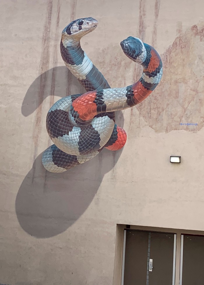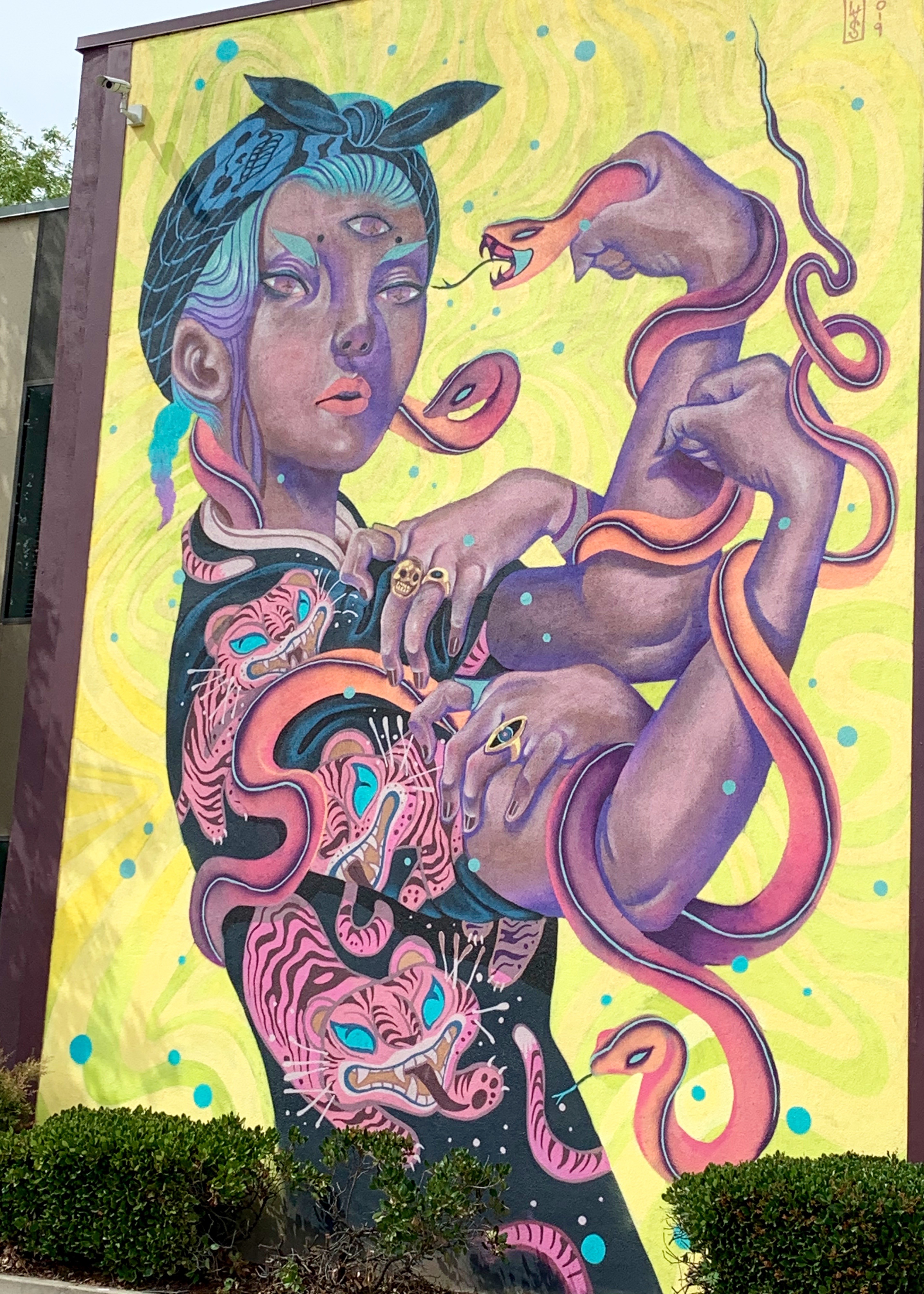 I know Bill from SABA, Julie is the volunteer coordinator for Wide Open Walls. There are over 700 murals in Sacramento, Wide Open Walls has curated 100 of them. For several years, for 2 weeks in August, muralists are invited from all over the world to complete a project. Julie knows a lot about all the murals and the artists. She designed a 6.5-mile bike route which visits 48 murals by 59 artists for Week 4 of May is Bike Month. We started at the California Auto Museum. On the south wall: