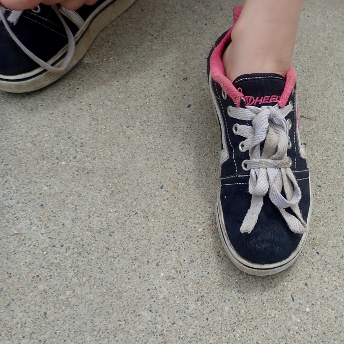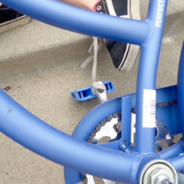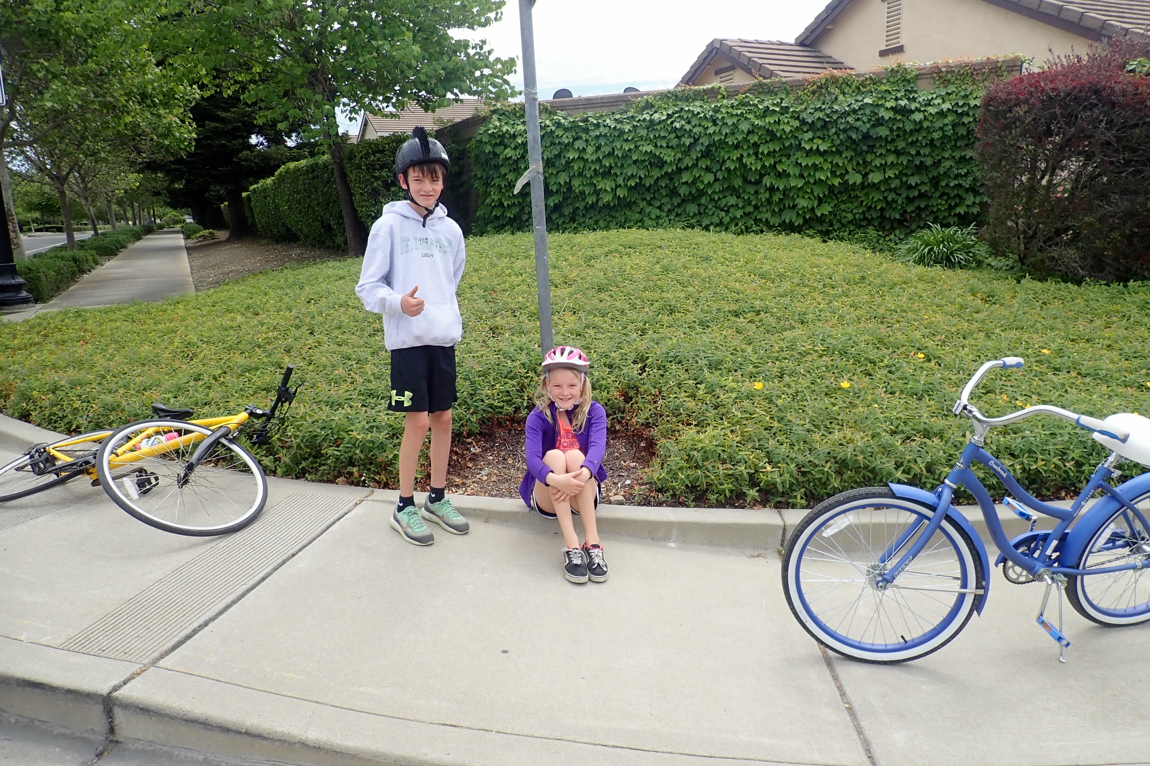 As Pete and I were coming down San Juan Rd from a bike ride, I looked across the street and happened to see a girl fall off her bicycle as she rounded a corner. Her brother was ahead of her. I rode over to see if I could help. A lesson for doing a “personal safety check” before going for a ride (top down): helmet, loose clothing, right pant leg rolled up and, in this case, … shoelaces!