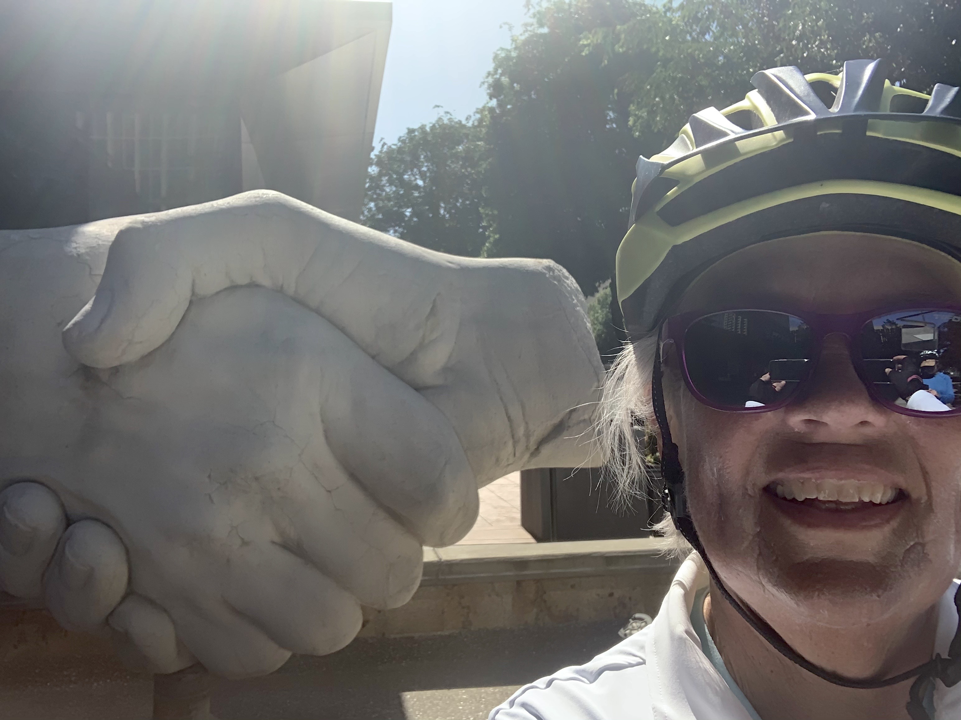 Today Pete and I rode downtown to take the last picture of a sculpture for a bike ride being promoted by SABA for May is Bike Month. Cyclists are supposed to visit 4 sculptures by Stephen Kaltenburg, take selfies in front of each, and post them to social media. This is my selfie in front of “Peace” at 555 Capitol Ave although this picture will only show up here because this blog is the only social media I do.