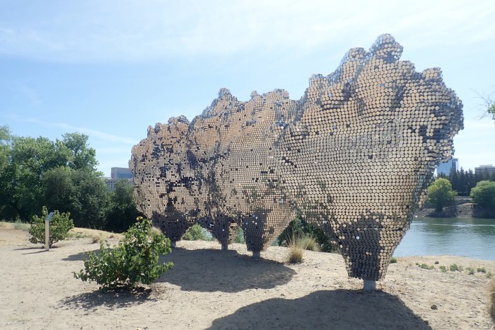 Almost full-size metal trees along the river. The shiny disks were only attached to the framework at the top, they moved easily in the breeze. Shimmering silver trees!