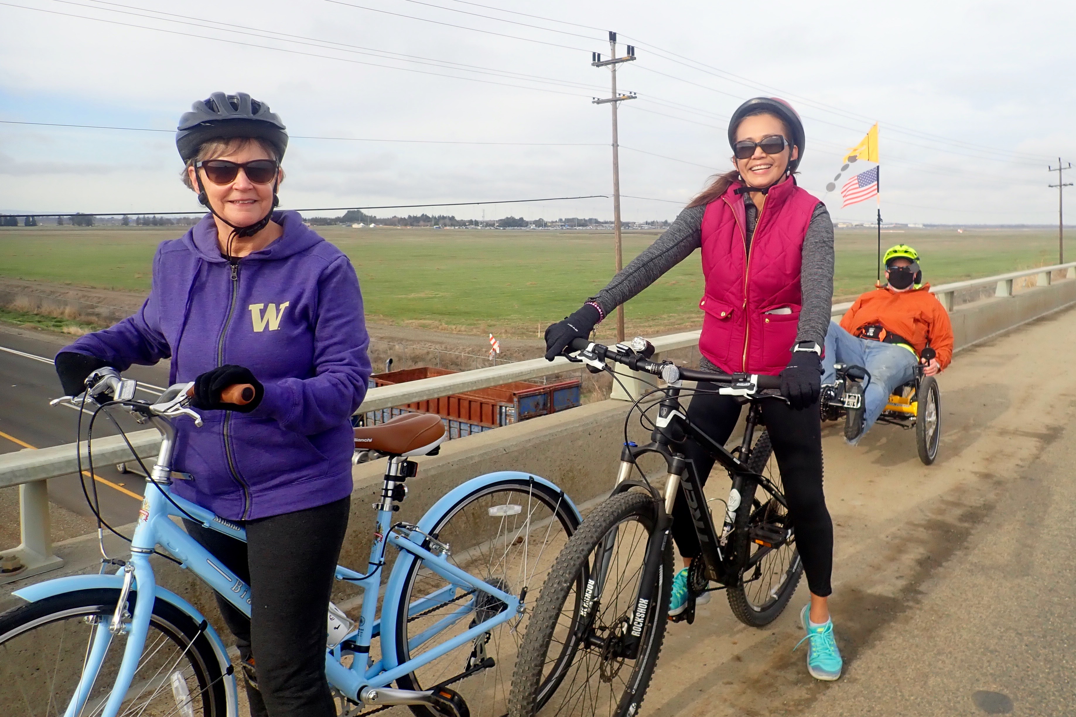 On Thursday, we rode around the Sacramento International Airport via the Garden Hwy, W Elverta Rd, and Power Line Rd: no bike lanes, 2-lane roads with no shoulder, almost no traffic, and no stopping. It was one continuous pedal – 16 miles.