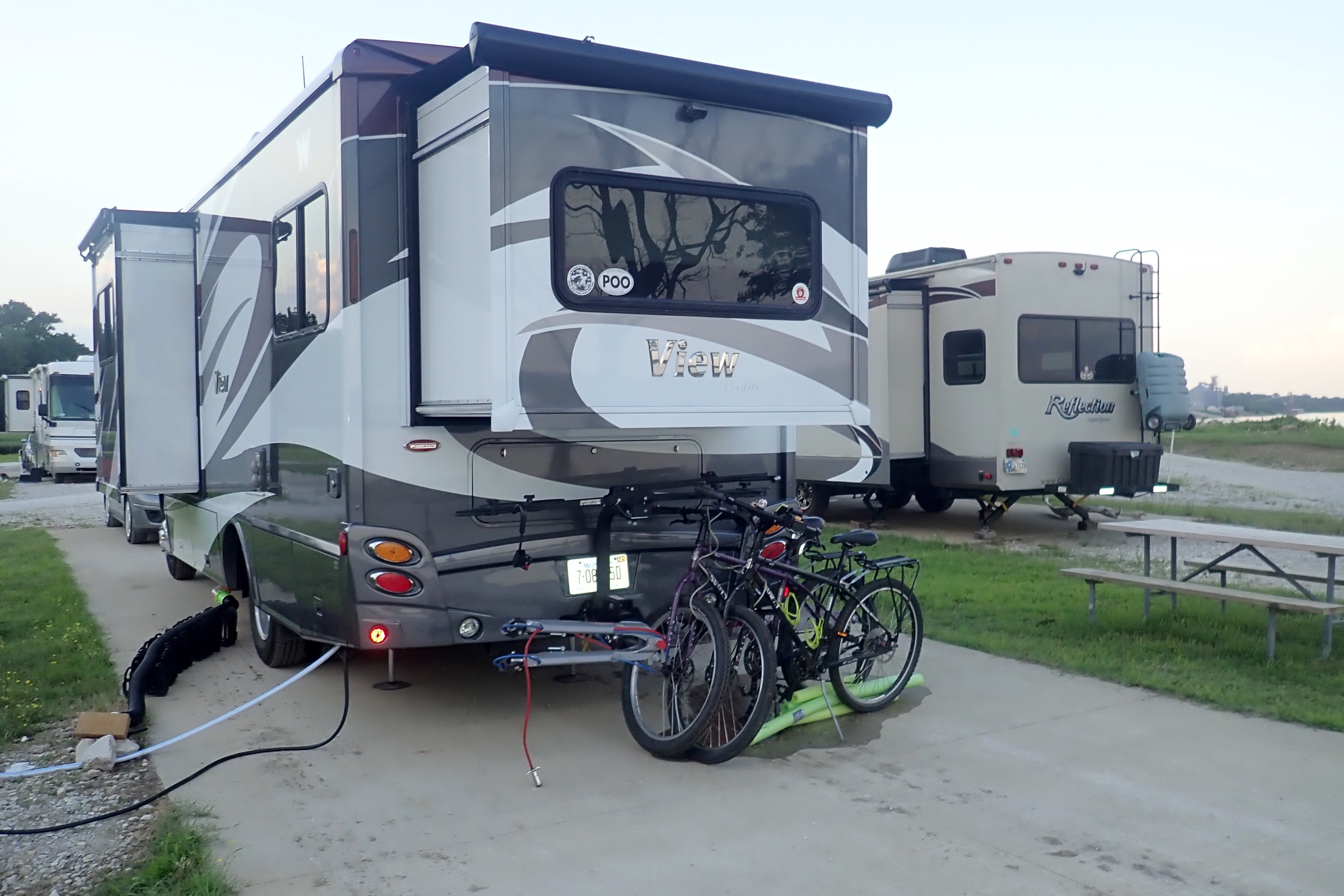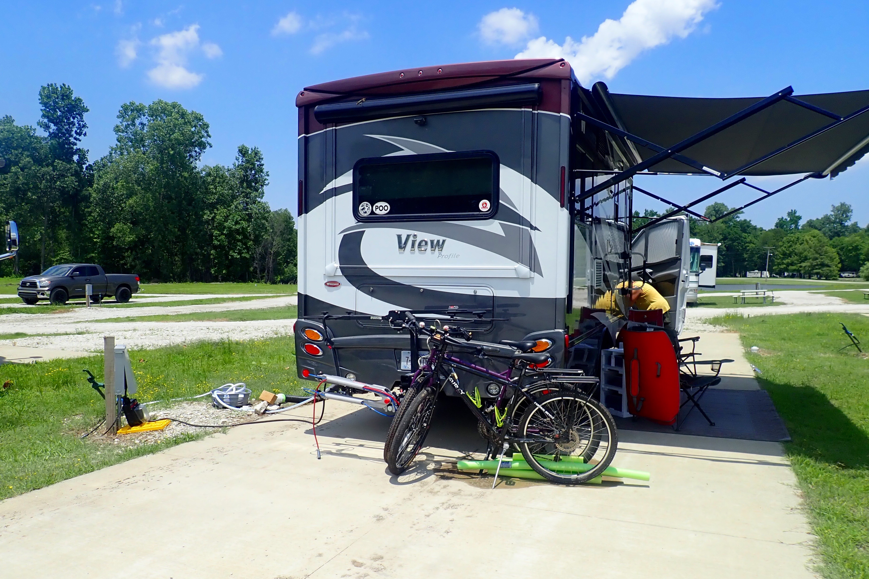 Our campsite at Tom Sawyer was full sun all day and it was hot. We left Saturday morning and drove to Sikeston MO for one night. And our site was (sad face) in the full sun again and it was still hot.