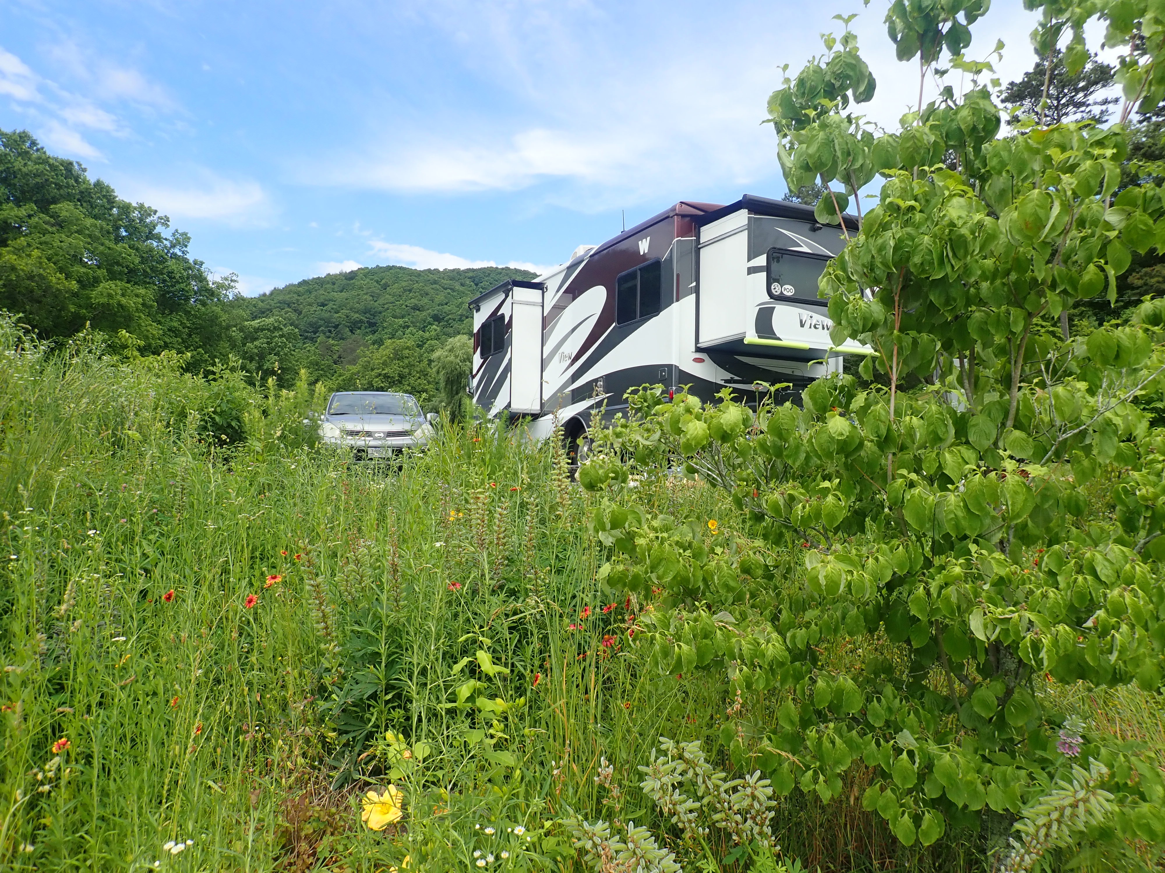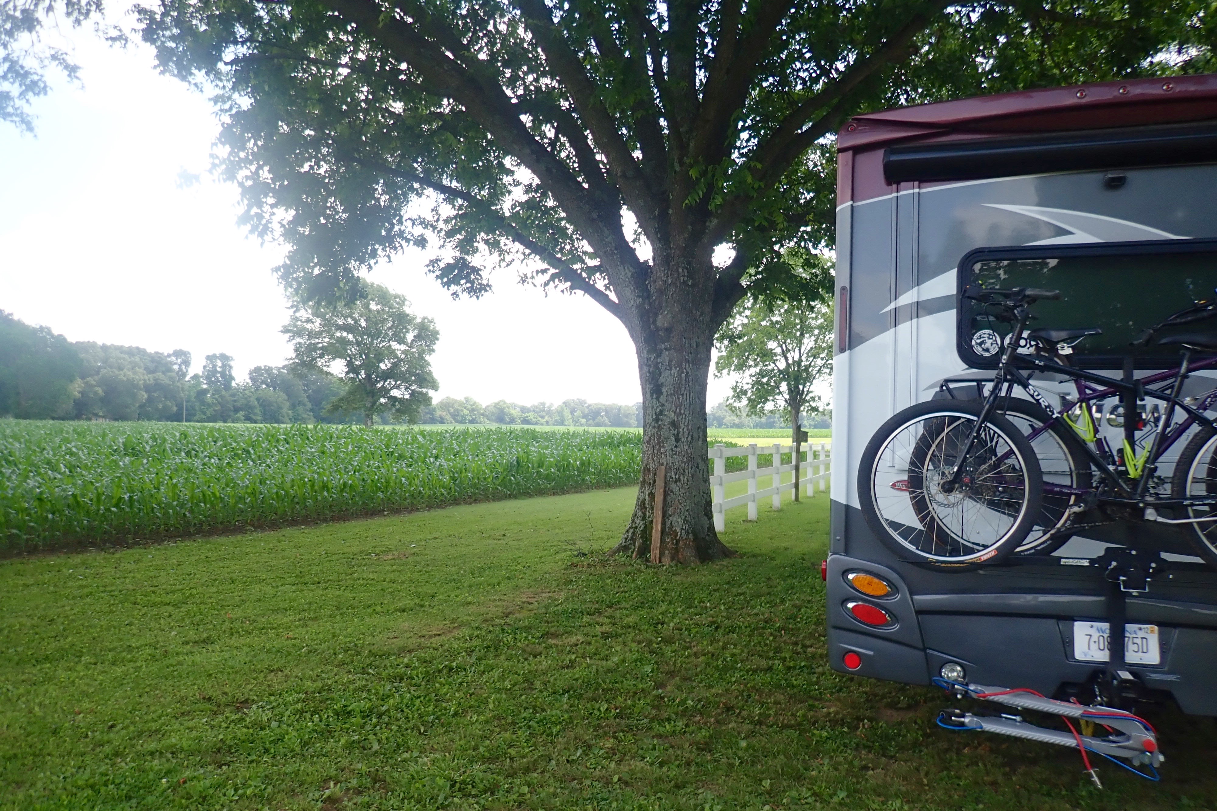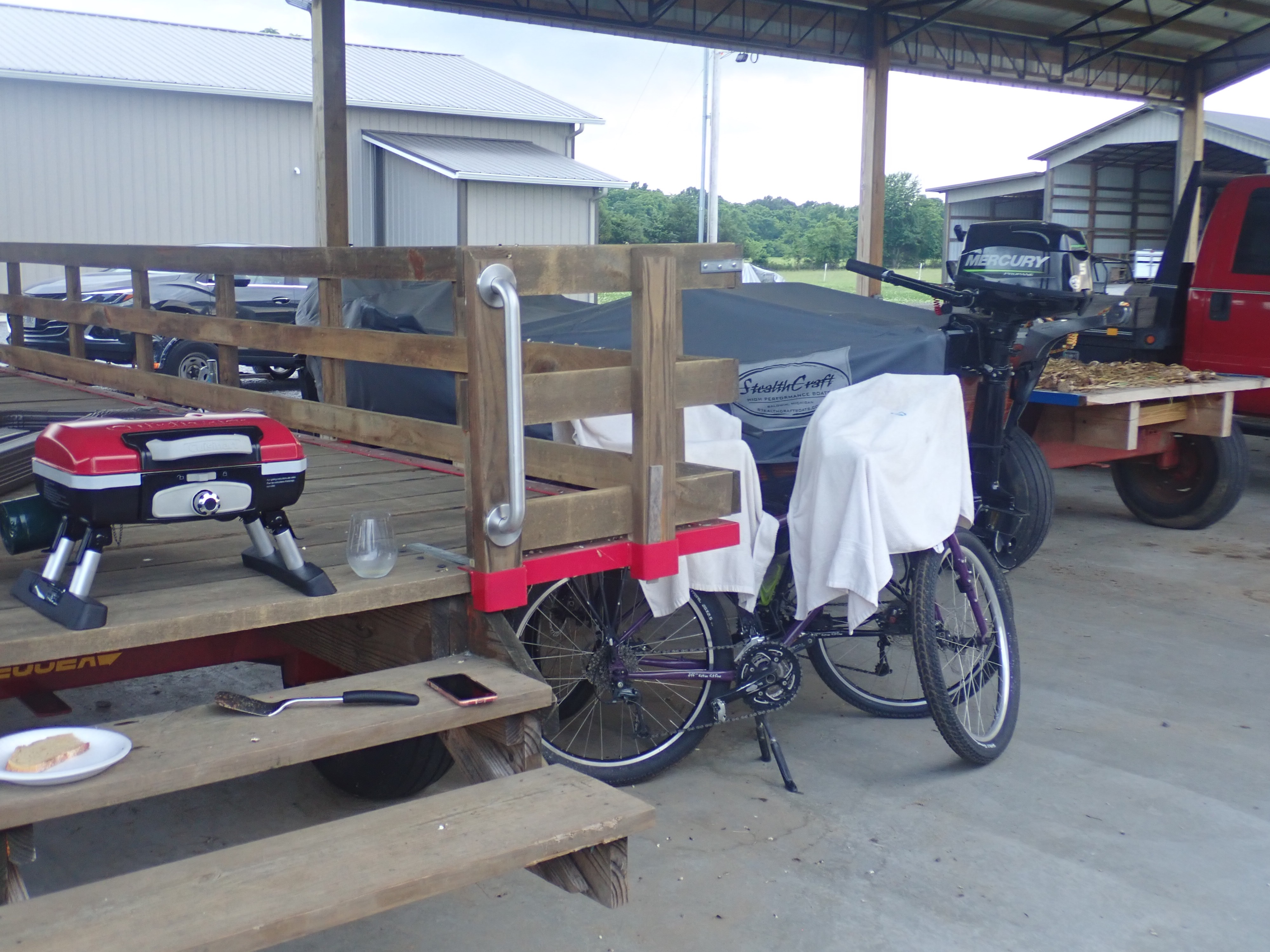 There were several RV spots, we parked next to an event space that also served as storage for farm trailers, a boat, etc. Our bikes became towel drying racks and the steps onto the hayride wagon was a good place for the grill.