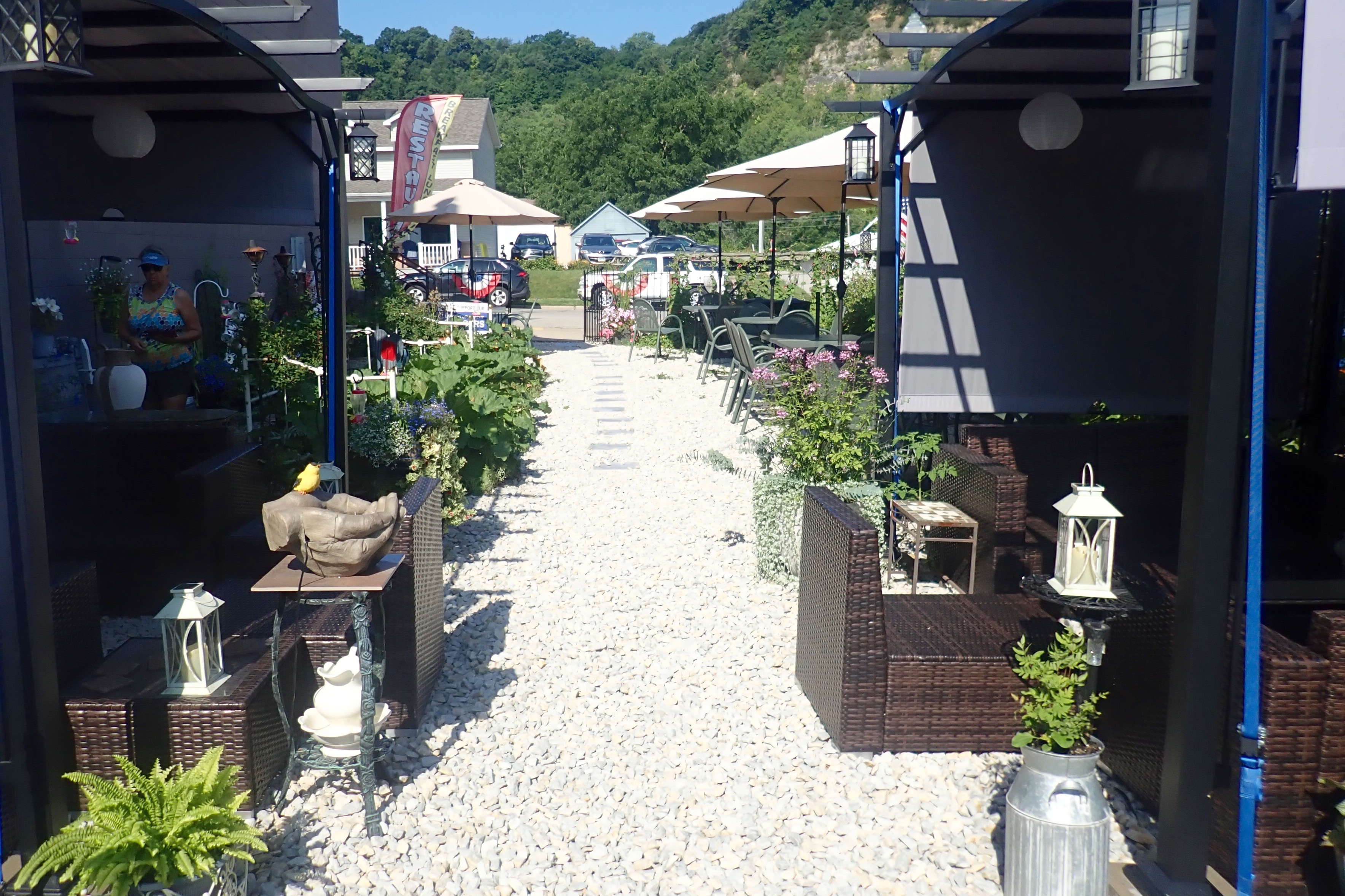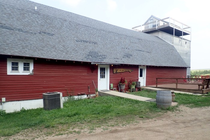 The main building featured the wine-tasting area and gift shop. The far door was the entrance to the music/dinner venue. The metal tower structure beyond that had two B&B apartments, the very top was an informal gathering area. There was a 2-bedroom apartment on the second floor at the left end of the red building. Included in the B&B was a bottle of wine and a hot breakfast (eggs in a cloud).