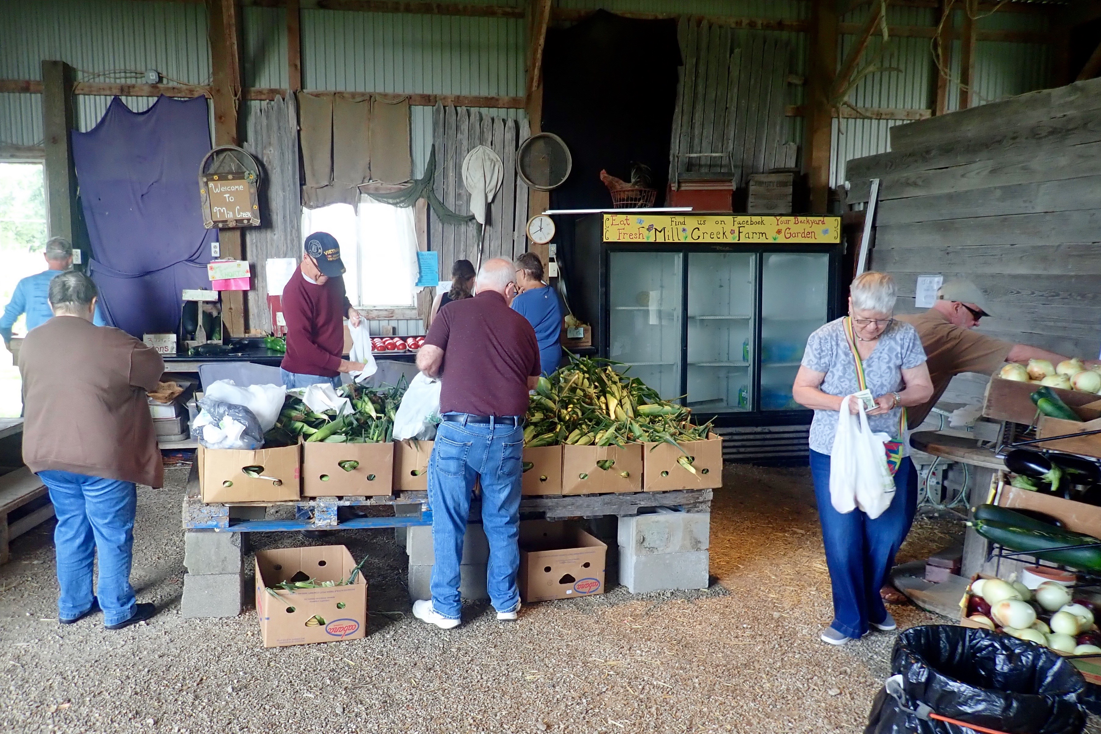 Mike asked if we could be gone by 8 am because of the sign he’d posted at the road. But we were able to move out of the way and stay a bit longer to see what happened when the sweet corn was ready at 8 am. It actually started the previous afternoon: cars drove in, someone got out to see what was available inside the barn. Corn? Tomatoes? In the morning, there were many who arrived early to find ! corn ready for purchase.