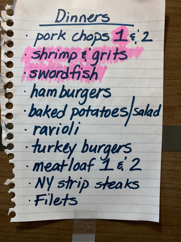 In order to keep track of what meals are available, I made a list and taped it to a cabinet: