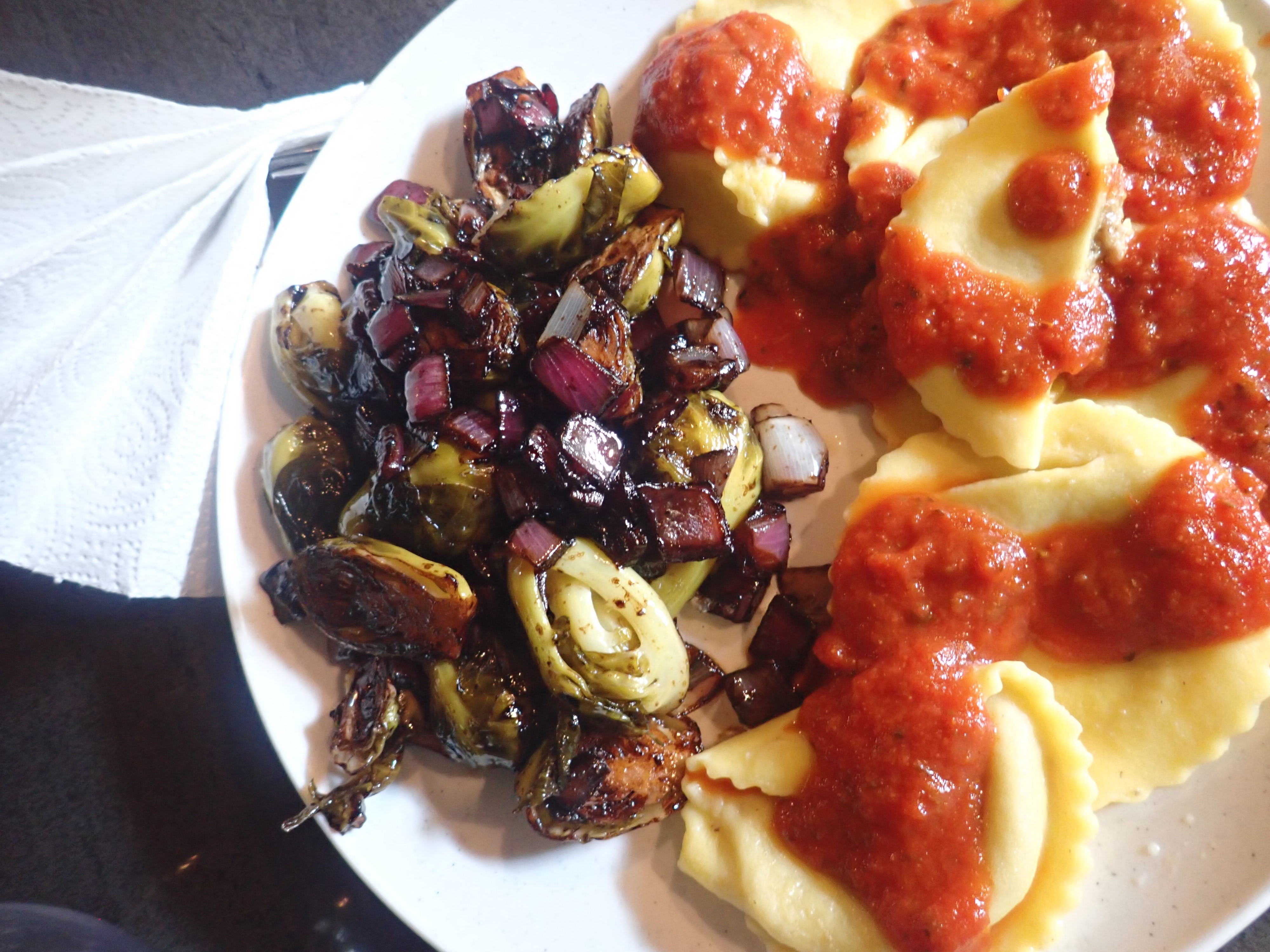 Viviano’s sausage ravioli and pancetta sauce with balsamic braised Brussels sprouts: