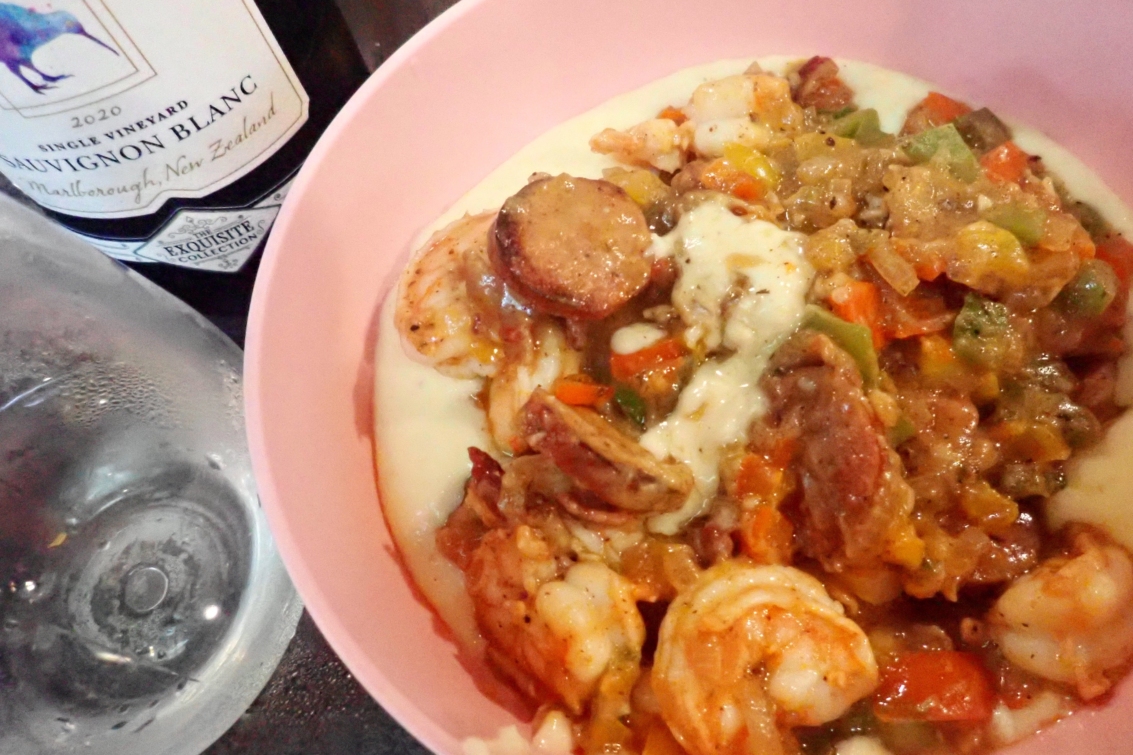 I’ve always thought “grits” sounded like an awful food and never chose it from a menu. You also don’t find it on California menus. When we were in Chattanooga on a food tour, a small tasting was served at one of the stops … very good. Billie’s been casually searching for a good recipe online ever since, then lining up the best place to buy the ingredients, then finding the right day to go through all the steps. Monday was the perfect day. OMG – this is the best thing Billie has ever made: