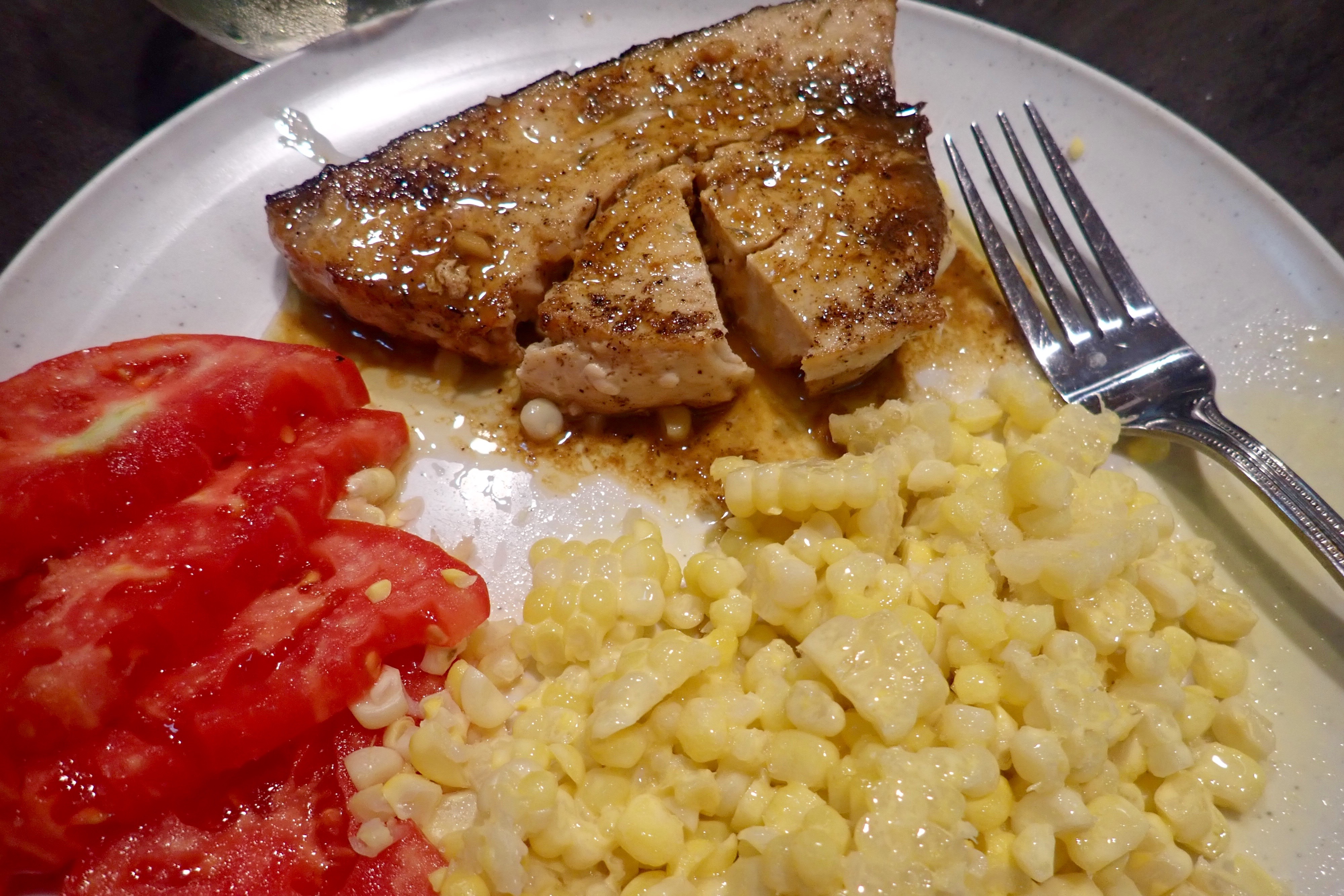 We had (excellent) pork chops on Sunday, swordfish with fresh corn and tomatoes on Tuesday: