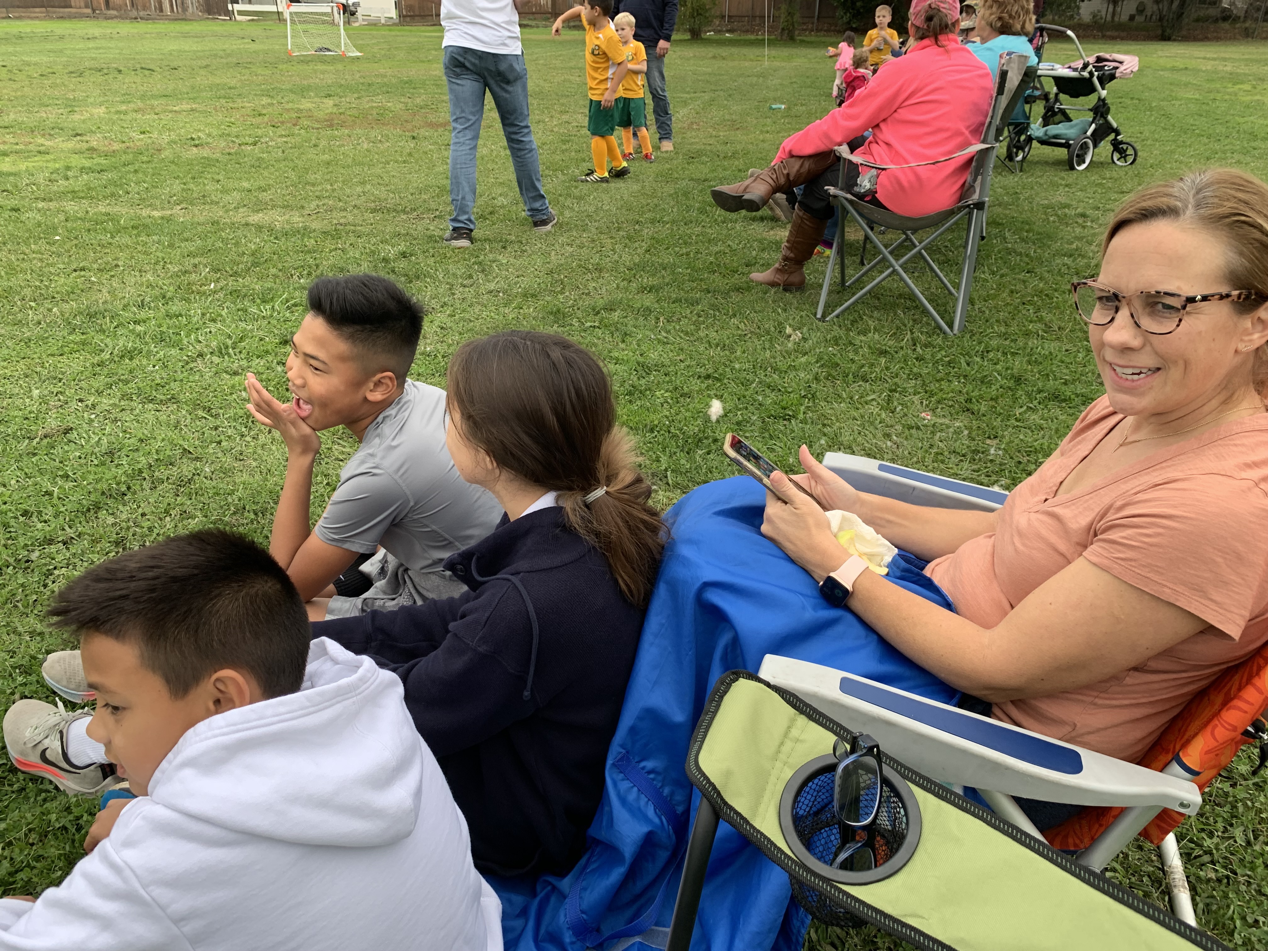 On the sidelines, Thais, Leo, Sophia, and Avery: