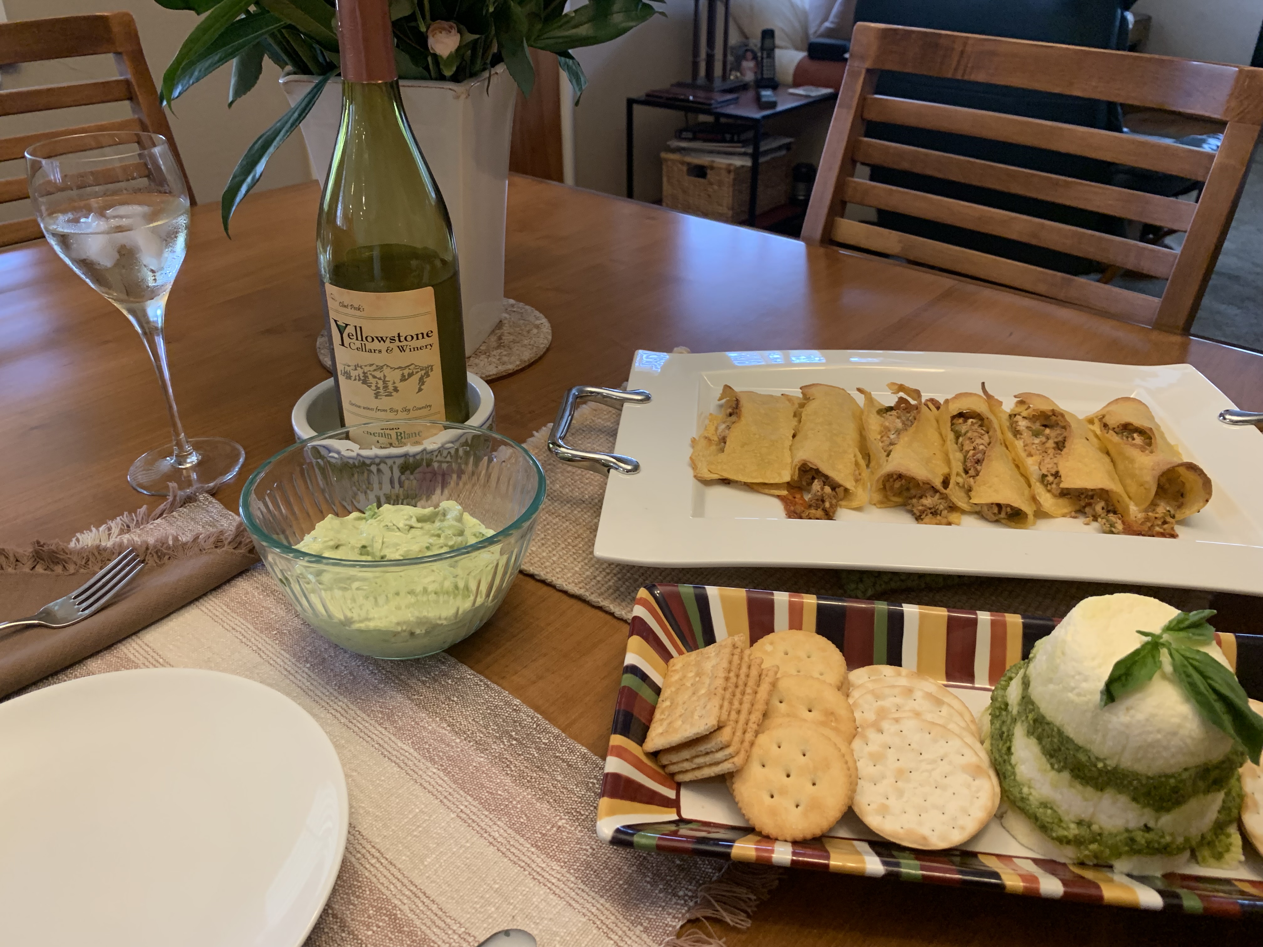 Another delicious get together. Salmon taquitos (that didn’t turn out picture-perfect) with avocado crema and a layered pesto torta. And a very good bottle of wine from Yellowstone Cellars in Billings MT.