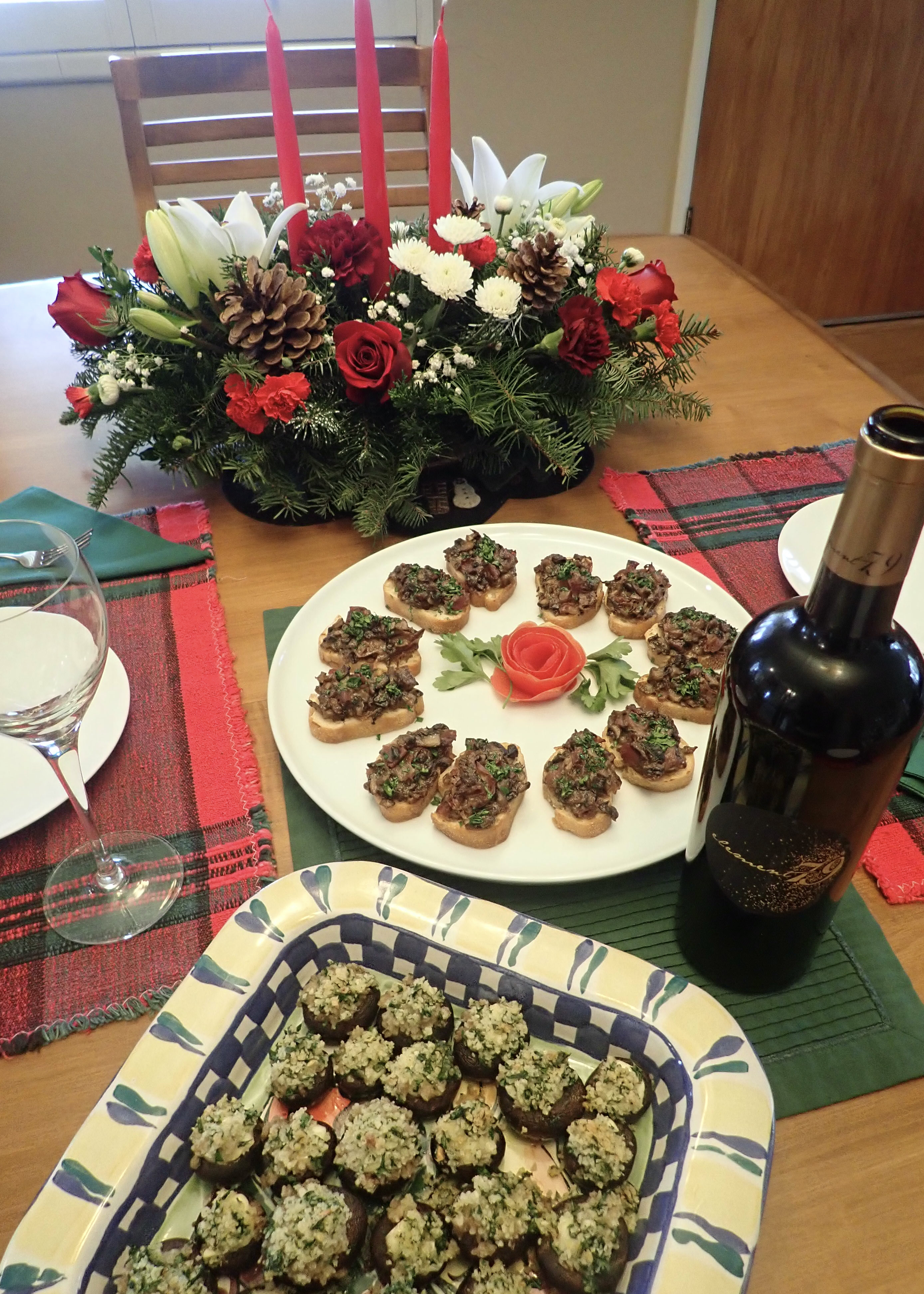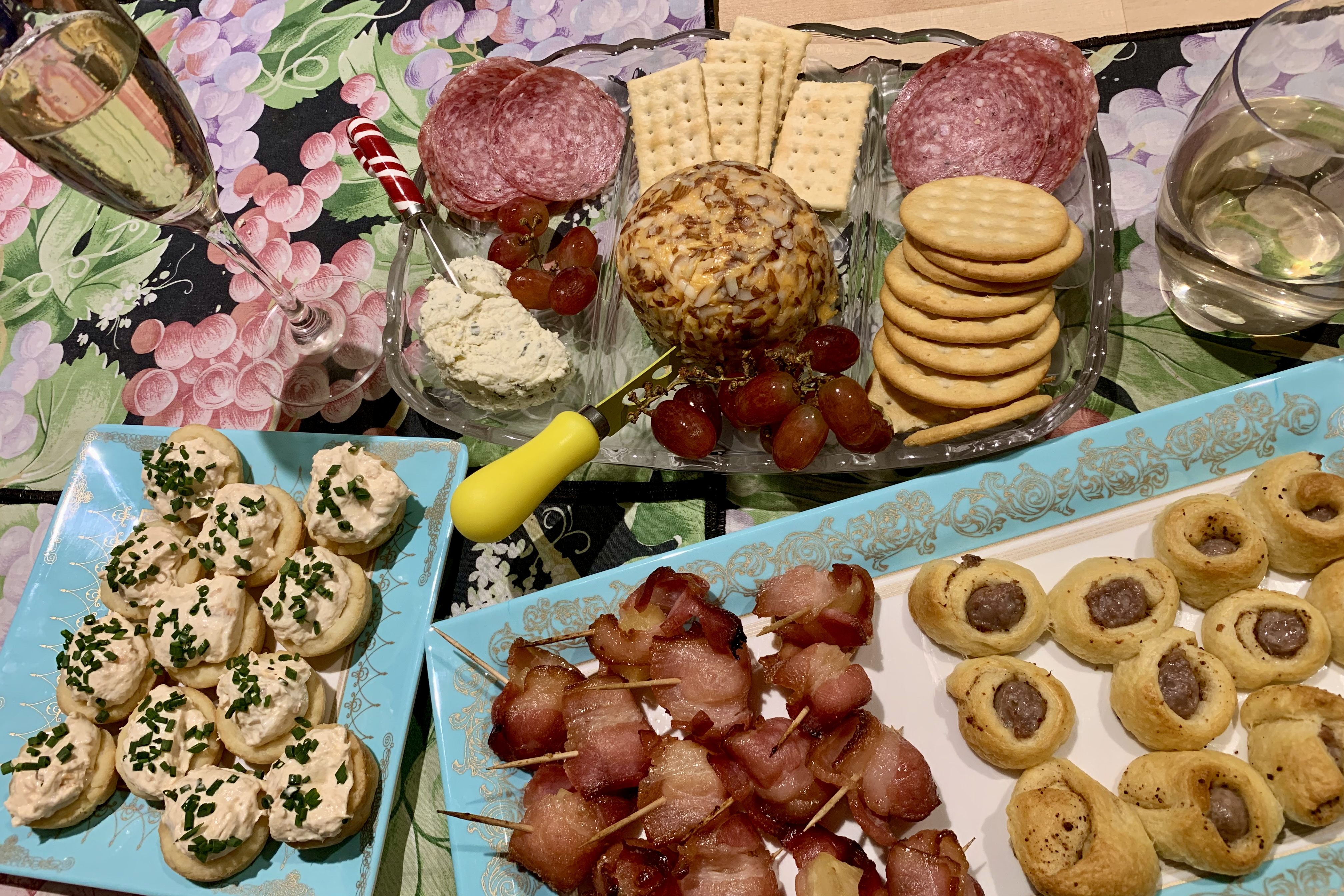 We’ve been enjoying some of our favorite recipes from long ago. Phil made a delicious chicken-rice casserole. Yesterday, I made a prosciutto-provolone stuffed focaccia to go with her chicken vegetable supper soup. Today we made appetizers for our traditional movies and champagne New Year’s Eve. Charcuterie board, sausage in crescent rolls, bacon-wrapped pineapple, and salmon mousse cups: