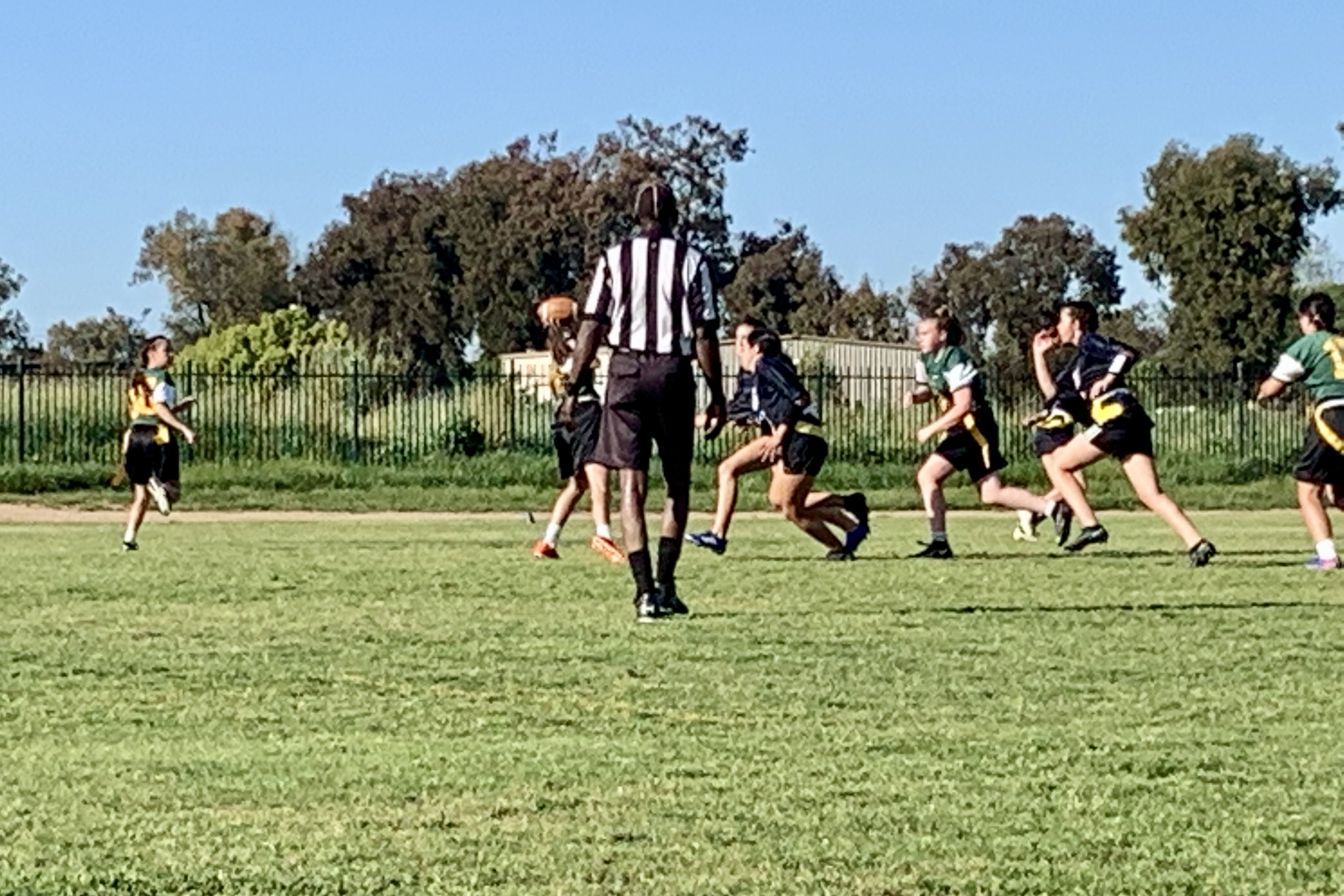 On Friday, we went to Sophia’s flag football game at St Patrick’s. Running back looking for the ball: